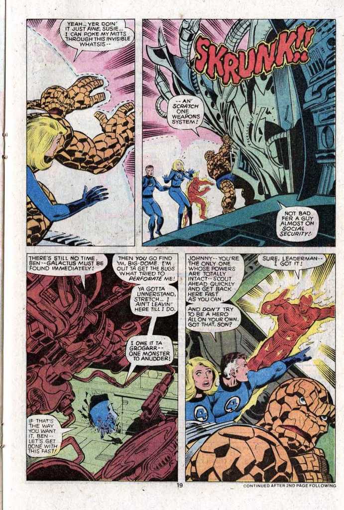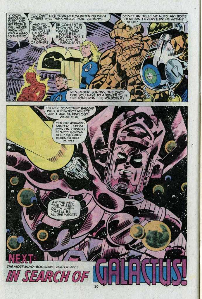 But when he gets there, Krogg is suspiciously dead, and the only one around who might have done the deed is HERBIE. But the robot insists that the termination of life functions isn’t permitted in his programming. This doesn’t prevent the Thing from side-eyeing him, though. Anyway, leaving the rest of the aliens in suspended animation with a rescue beacon set up to alert others of their kind to their whereabouts, the FF zip off in the Nova ship in pursuit of Galactus. To Be continued. It’s a meh issue, to be honest, and I felt that way about it at the time. Especially with the addition of Byrne to the creative team, this felt as though it should have been a home run. But the creators weren’t yet pulling in the same direction.