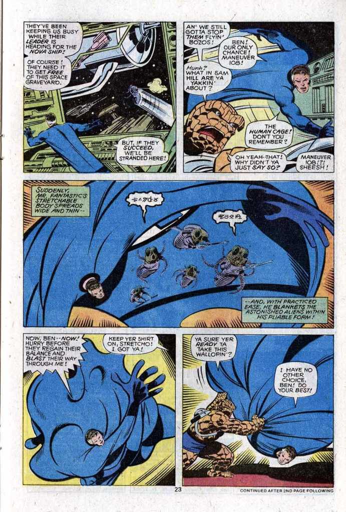 What follows is kind of a blah action sequence, far from one of Byrne’s finest. He was typically truly adept at coming up with interesting action beats, but here, with the FF facing a dozen flying bugs in armored carapaces, it feels like he’s a bit uninspired. Anyway, the FF get jumped by the aliens, and while they fight back, the alien leader Krogg attempts to zip over to the Nova ship and claim it for himself and his men–they need it in order to escape the Sargasso. The team, though, puts a quick kibosh on most of the aliens, with Reed enveloping them within his own expanded body and then Ben smacking Reed against the bulkheads again and again until the bugs are all stunned. With that, the Thing punches a hole in the skin of the ship and Reed attempts to stretch over to their own craft before Krogg can get away with it.