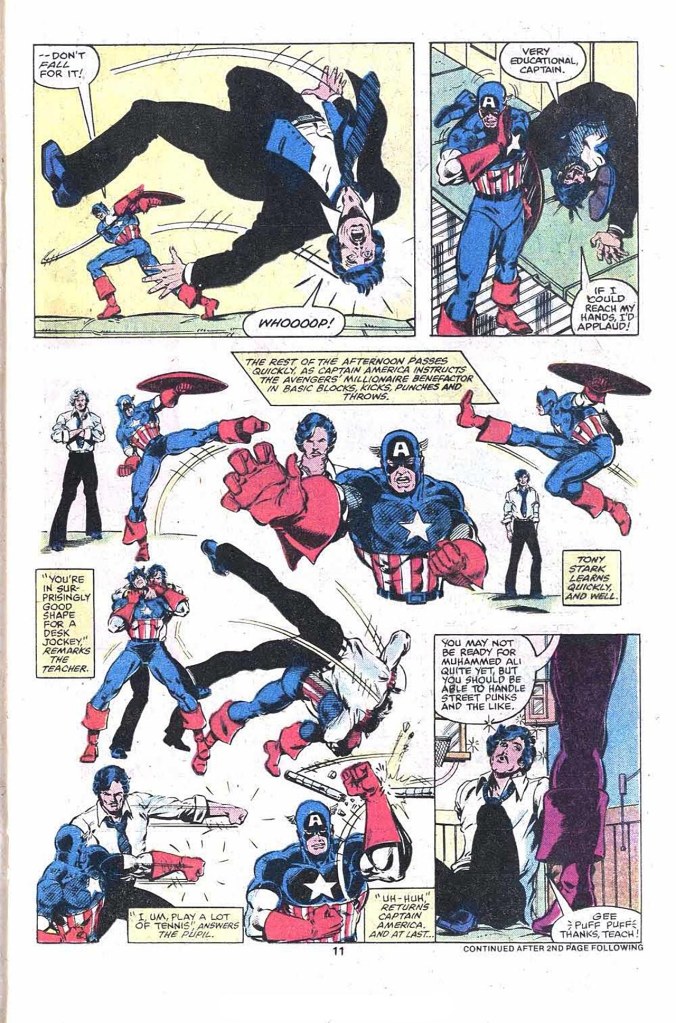 However, the pressure of the situation causes Tony to immediately go on a bender, and he shows up at his offices the next morning still reeking of expensive alcohol and completely hung over, much to the disapproval of his executive assistant Mrs. Arbogast. Tony’s response is understandable, in that SHIELD is trying to take over his company, he just parted ways with longtime love interest Whitney Frost after inadvertently causing the death of her father Count Nefaria, and now he’s got a murder charge hanging over his head. But Tony picks himself back up at this point and heads over to Avengers Mansion, where he asks Captain America for a crash-course in self-defense. He tells Cap that he needs to know how to defend himself with his bodyguard Iron Man unavailable to him, but he’s actually got something a bit more dangerous in mind.