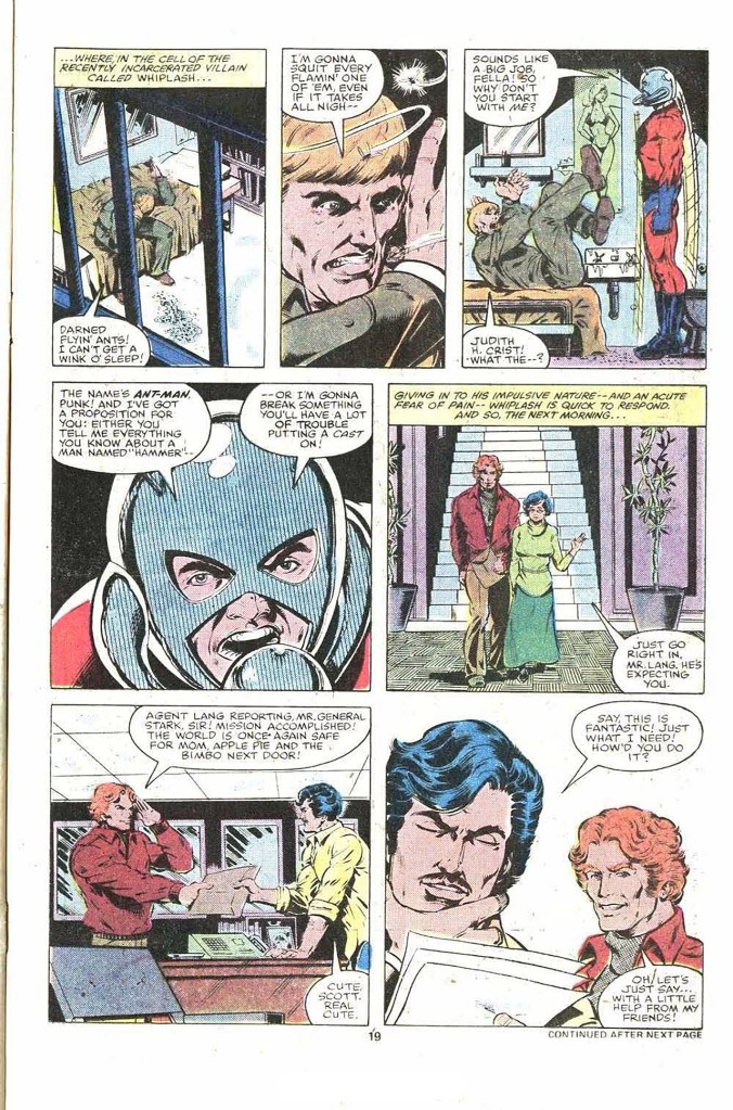 And that’s to track down the person who’s been causing his armor to malfunction and fail. During his recent battle with Whiplash, the super-criminal made a passing reference to “Hammer”, and that’s the only clue Tony has as to the architect of his misfortune. So he seeks out ex-con Scott Lang, who is now working as an engineer on the Stark payroll. Tony wants Lang to help him get some intel from inside Ryker’s Island where Whiplash is incarcerated, not realizing that the man he’s speaking with is the new Ant-Man. Lang owes Tony for his second chance at the straight-and-narrow and he offers to get Stark what he needs. Which he does, by donning his Ant-Man gear, infiltrating the prison and interrogating Whiplash.