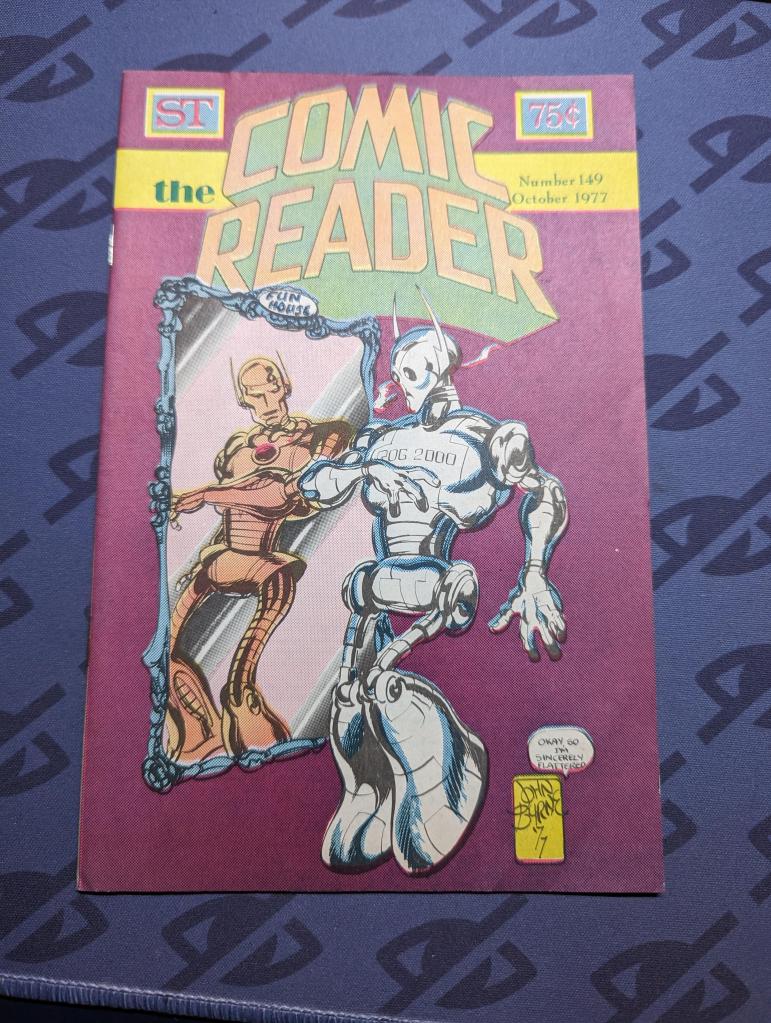 ROG 2000 had a distinctive enough design that it went on to inspire artist Joe Staton when he was called upon to redesign the DC character Robotman as part of the New Doom Patrol tryout in SHOWCASE. Staton had been drawing the E-MAN series that the ROG 2000 back-ups had first seen print in, so there’s no question that he was aware of the character and took some points from his design, virtually lifting it entirely. After SHOWCASE came out, Byrne did a cover for the COMIC READER pointing out the similarity.