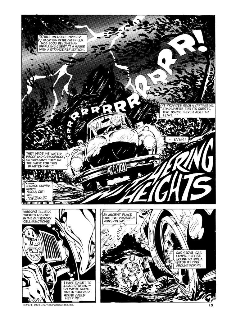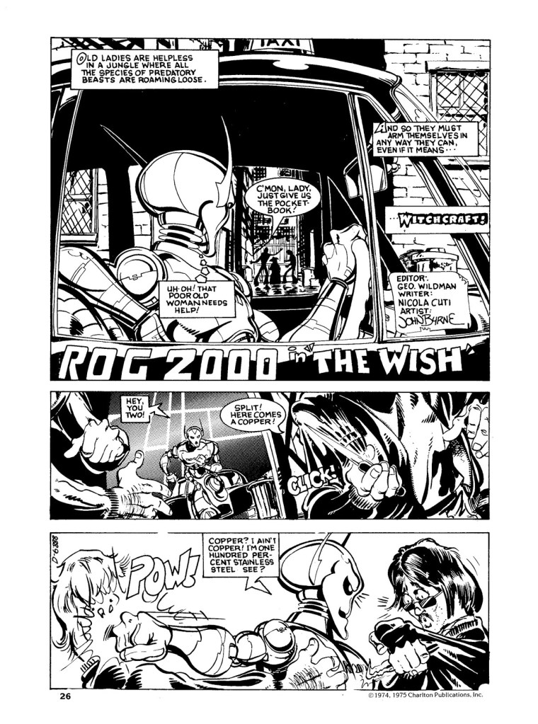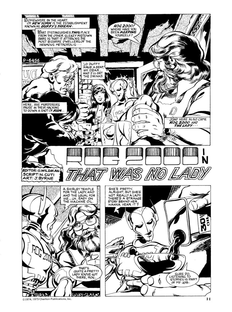 These four ROG 2000 stories were a bit obscure, but they helped Bryne to hone his skills to the point where he could eventually pick up work at Marvel–Duffy Vohland, who appeared in the first of the four strips as a tavern owner, championed Byrne’s work to the editors up at Marvel. In this incarnation, ROG 2000 is a cab driver by vocation who winds up getting involved in a series of strange misadventures in the big city. The pilot outing has ROG contending with the super-villain Magno, who wields a weapon devised by ROG’s own creator, the inventor Burns. Burns has also perfected a plastic-based female android, Syntac, who helps ROG out in defeating the villain. It’s a light-hearted and not entirely serious strip, but it was loose and had a lot of Byrne’s signature charm in the artwork. Later installments would bring the robot into conflict with a haunted house containing an all-devouring protoplasmic blob, a bog-monster in the sewers and an urban witch who temporarily gives ROG the unwanted gift of humanity.
