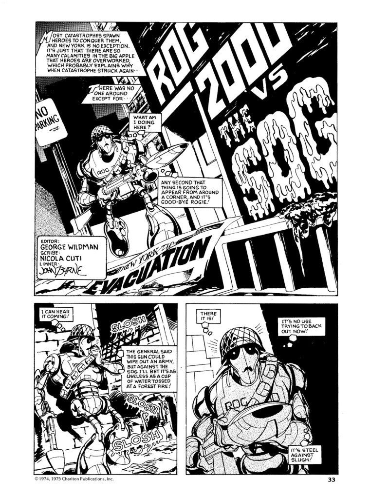 Byrne’s design for the character was a good balance between cartoonyness and plausibility, and he became something of a signature character in Bryne’s early days. After John broke in at Charlton, editor Nick Cuti suggested that he and Byrne might consider doing a more serious version of the character in a back-up strip that could run in the recently-launched E-MAN title. The CPL Gang had a strong relationship with the staff at Charlton, having produced the firm’s in-house FOOM-style fan magazine the CHARLTON BULLSEYE for them. As this represented an opportunity for Byrne, he leapt at the chance, producing four short ROG 2000 installments that ran in E-MAN #6, 7, 9 & 10.