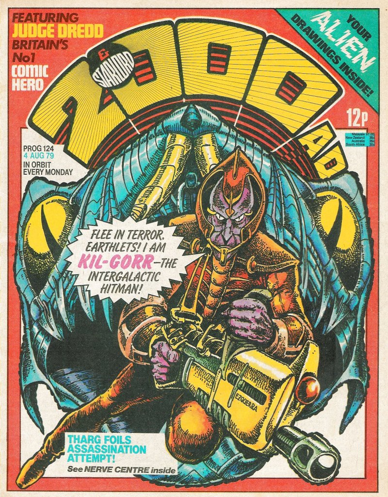 This was the third issue of the British weekly 2000 AD that I picked up on my very first visit to Xanadu Comics in Wilmington after my family had relocated to Delaware. This cover image is interesting, in that it doesn’t represent any of the material that’s actually in the issue. It appears to have been just a spot illustration that artist Carlos Ezquerra did for one purpose or another that was repurposed as a cover for this issue. There’s an attempt through copy to connect the depicted character, Kil-Gorr the intergalactic hitman, to the comic’s alien editor Tharg, but once readers turned to the editorial page on the inside front cover, they became instantly aware just how tenuous that connection truly was. However, the point was to get schoolchildren to pick up this latest issue, and so the intense and alien image certainly fulfilled its purpose, even if it is a bit of a swerve and a cheat.