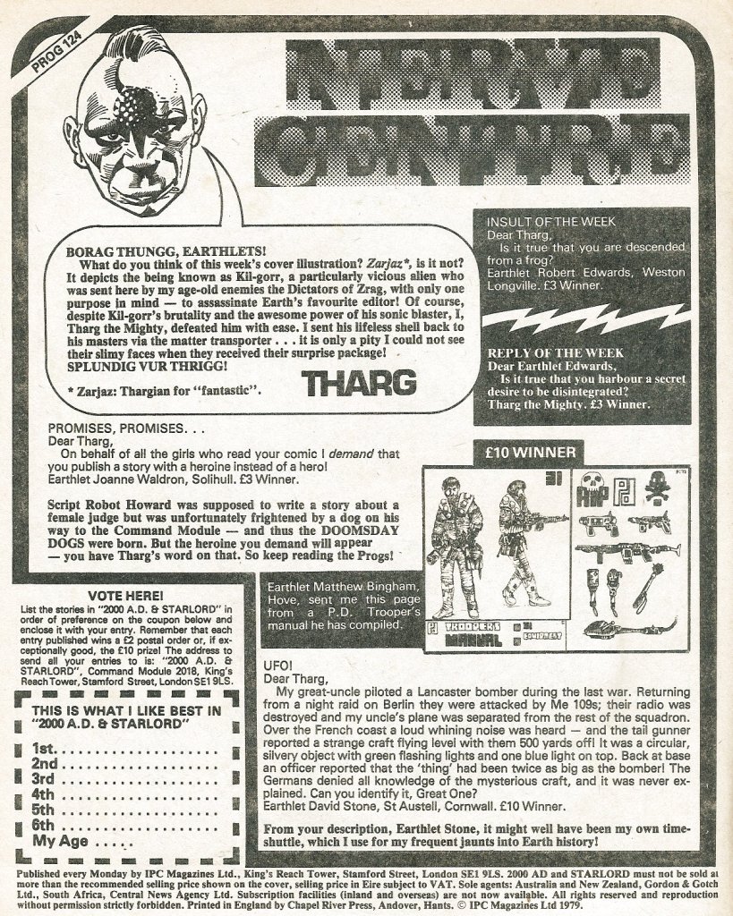 As I’ve spoken about previously, I found all of the editorial material and even the overall approach of 2000 AD itself to be pretty interesting, a departure for what i was used to in the American comic book market of the day. It had a certain grungy sensibility to it, one that stemmed in part from the cheapness of the materials–the weekly was printed on coarse newsprint, including the cover, so it wasn’t designed to be an object of permanence but rather a disposable piece of momentary entertainment, like a newspaper. That counter-culture anti-authoritarian flavor permeated the stories as well–the entire thing felt just a little bit punk, for al that it was also clearly a corporate money-making product. But I liked this difference in flavor, even if distribution in the U.S. would continue to be spotty for long enough that I never became a regular weekly reader.