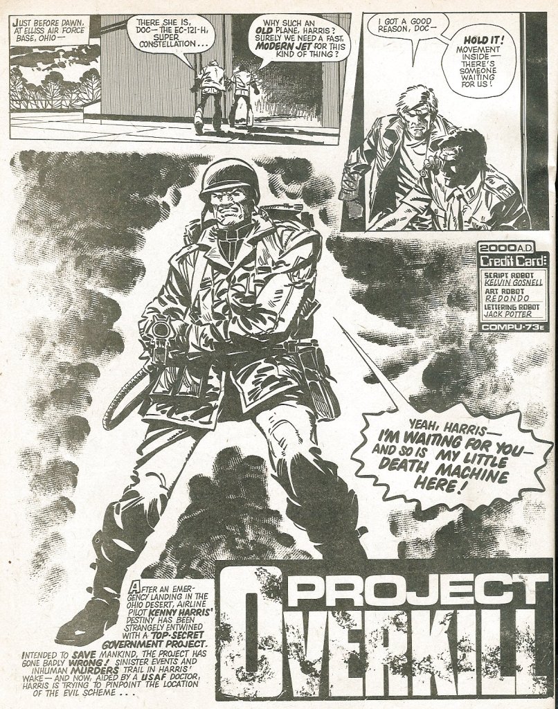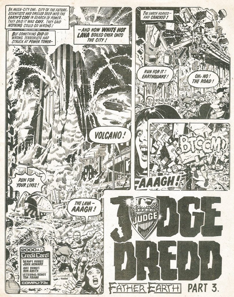 Judge Dredd was the most popular feature in 2000 AD, and he opens the book up once again with the third installment of the Father Earth serial. It was written by John Wagner and illustrated this time not by the great Brian Bolland but rather Ron Smith. Smith’s style wasn’t as clean and polished as Bolland’s, but it was somehow a bit more Marvel in its approach, and so I didn’t mind the trade-off much at all. In this chapter, the Doomsday Dogs’ sabotage of the geothermal tap of the Power Tower that maintained Mega-City One’s defenses had caused a makeshift volcano to rise up in the middle of the metropolis, allowing Father Earth and his mutant hordes to overwhelm the barricades and attack the town. At Dredd’s order, the Judges deploy their Holocaust Squad into the volcano, a trio of specialist whose protective suits can only survive in the inferno for three minutes. It’s a suicide mission, and all three men do perish, but they’re able to tamp down the volcano before their demise. As the installment ends, Dredd is ready to turn his attention directly to Father Earth. To Be Continued! I never read the rest of this story, so I don’t know how Dredd sorted out Father Earth to this day.