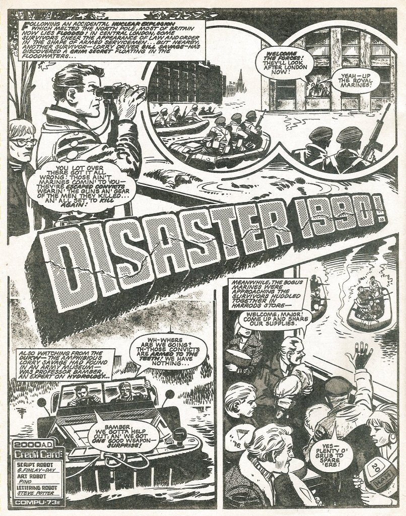 What followed was another installment of Disaster 1990, the prequel to Invasion by Gerry Finley-Day and Carlos Pino. This chapter picks up where the last one left off, with escaped convicts posing as Royal Marines about to plunder hapless civilian survivors who are holed up in what remains of the Harrods department store. It’s down to hard man and former Lorry driver Bill Savage to put these bad guys to rout in the most brutal way possible. Savage is outgunned, but he does manage to evacuate some of the survivors by the chapter’s end, though they’re being pursued through the flooded streets by the faux Marines as the story is To Be Continued! Again here, I have no idea if Savage made it out or how.