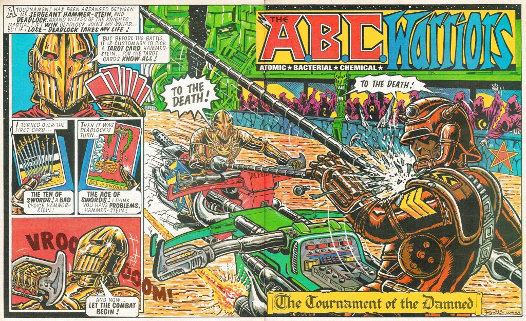 The midpoint of the issue brought back color for a single spread at the start of the ABC Warriors chapter. This week’s episode was still written by Pat Mills, but artist Brett Ewins subs in for the distinctive Kevin O’Neill. Consequently, this outing isn’t as all-fired awesome as the previous two. In order to save his imprisoned crew and recruit the robotic warrior-priest Deadlock to his command, Hammer-Stein is forced to joust Deadlock in a public arena. He’s able to win out through grit and stubbornness, and because the Tarot Cards that Deadlock uses to guide his actions never lie. But even though Deadlock is now another recruit in the unit, the next robot they need to bring on board, General Blackblood, has such a fearsome reputation for atrocity that Hammer-Stein would rather not even work with him. But that’s for next week’s chapter to sort out.
