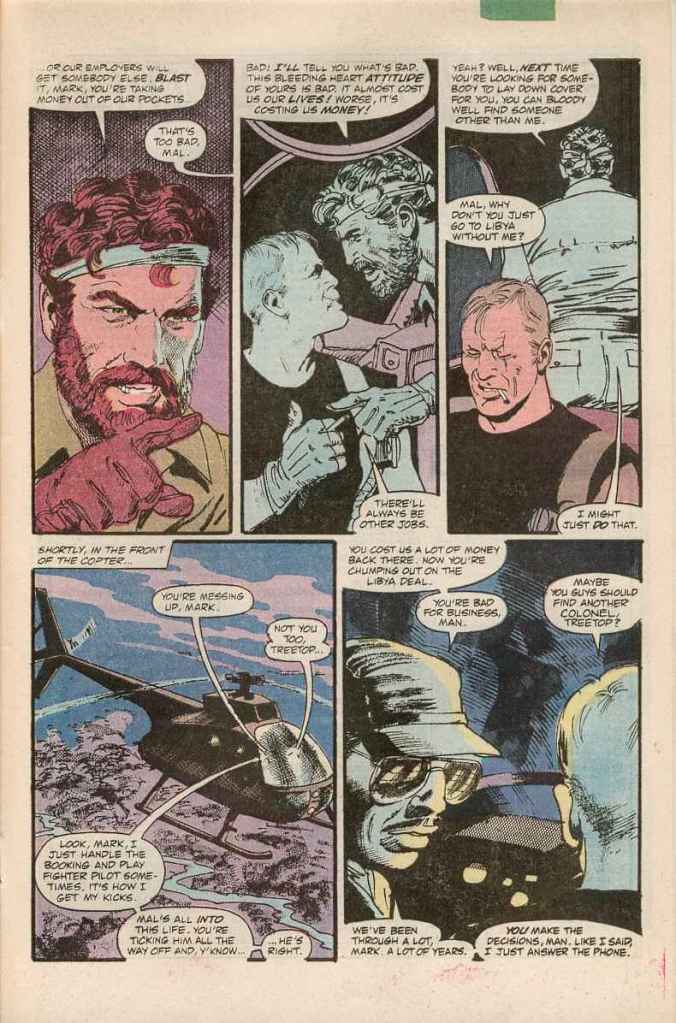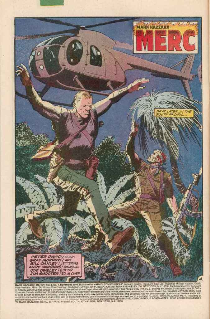 MARK HAZZARD: MERC #1 was written by Peter David, who was then just starting out his career as a writer. He had been laboring in Marvel’s nascent Direct Sales department working under Carol Kalish and trying to make inroads into getting stories published by the company. But there was strife and division between the sales department and Marvel editorial, so it was a difficult divide to bridge. David’s benefactor in this regard was editor Jim Owsley, who hired him to do a SPECTACULAR SPIDER-MAN Annual. From there, Owsley would turn to David with increasing regularity–as in this instance, when he needed somebody to execute Goodwin’s basic concept. David put his effort into making the series more than just a testosterone-fueled A-Team romp in which muscular men shot up foreign bad guys while making one-liner quips. He gave Hazzard a home life, with a wife who had divorced him due to his mercenary lifestyle and who had subsequently remarried. Hazzard was caught in-between wanting to be there for his ex-wife and their son and his obvious skill and love for the art of warfare through which he plied his trade.