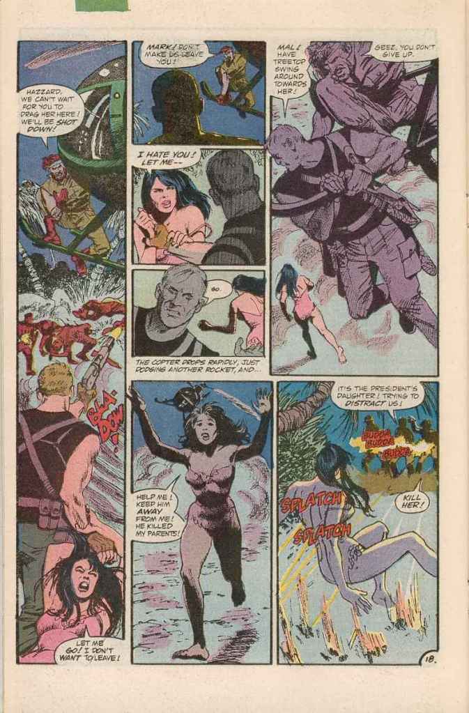 Having carried out their mission, Hazzard and Mal are paid by the rebel leader, who indicates that despite their slogans about freedom and democracy, doesn’t intend to hand over control of the nation now that he’s wrested it away from its former President. Hazzard is disquieted by the notion that he’s just replaced one greedy scumbag with another, and so when he comes upon some of the rebel soldiers arguing over who will get to have their way with the daughter first, he intercedes, carrying the girl off despite her protests. But thanks to his actions, he and Mal have gone from being heroes of the revolution to dangerous wanted criminals, and they have to fight their way to the exfiltration zone where they can be picked up by Treetop. Along the way, we learn more about Hazzard’s past in flashback, how he was once a promising West Point cadet before dropping out to join the army to fight in Vietnam, where he served three tours of duty. But as they get to the pick-up zone, the terrified girl breaks away from Hazard and runs back towards her attacking countrymen–who cut her down without a second’s hesitation. This is an appropriately nihilistic comic book.