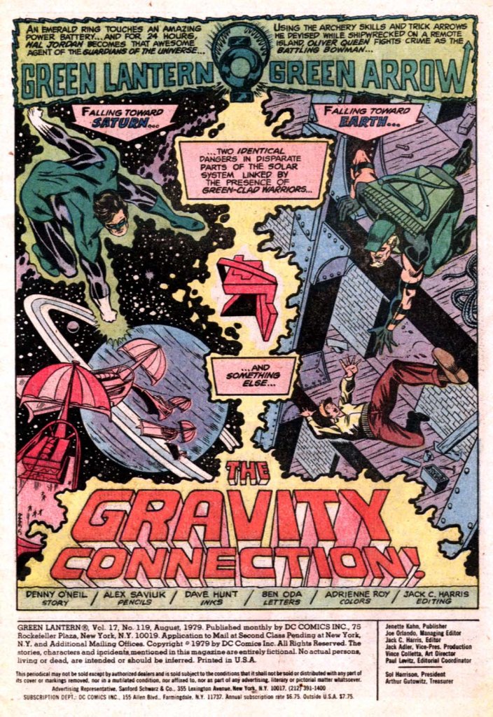 The cover to this issue of GREEN LANTERN bugs my eye in a way that it didn’t when I first bought it back in 1979. Having spent time working with John Romita Sr., who was attuned to every discontinuity in spatial relationships on a cover and made me similarly sensitive to them, it bugs me tremendously that the bowstring to Green Arrow’s bow is positioned in front of his hat, when it must be further back into space than that, even if it was newly-fired. That overlap is about all that I can focus on here. It’s not a terrific cover even without that, with both characters soliloquizing in the time it’s taking for the falling high-rise worker to plummet earthward. So I can’t say that I think it’s very effective. It certainly doesn’t especially make me want to crack it open and see what happens. And yet, that’s just what we’re going to do.