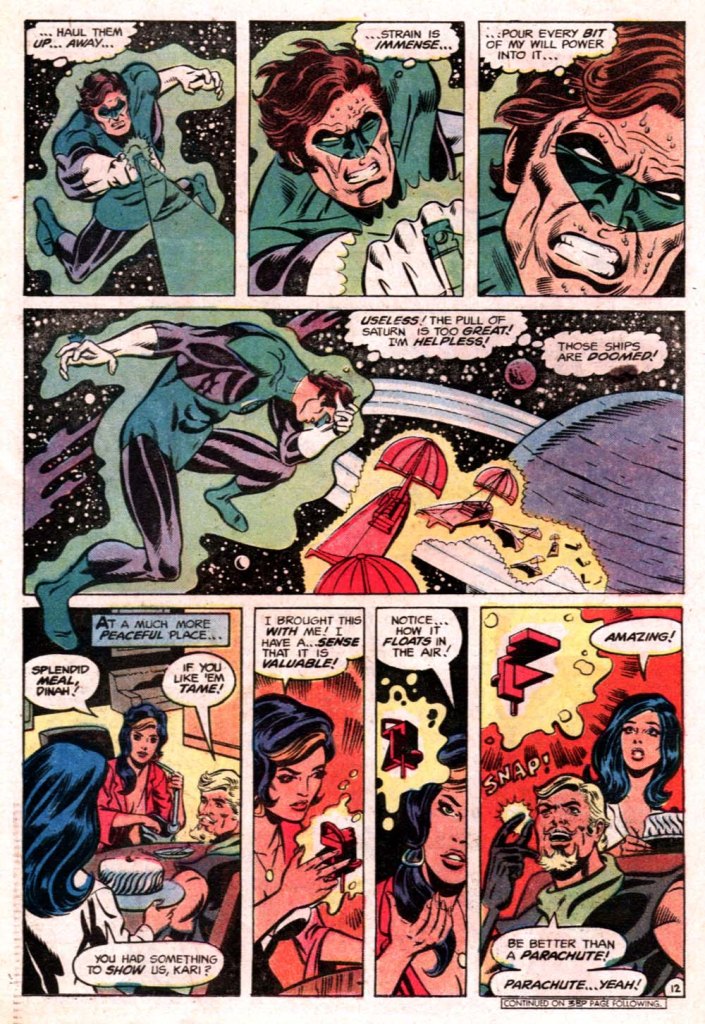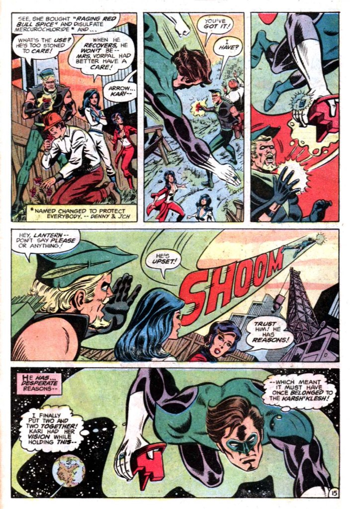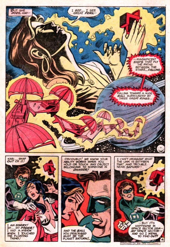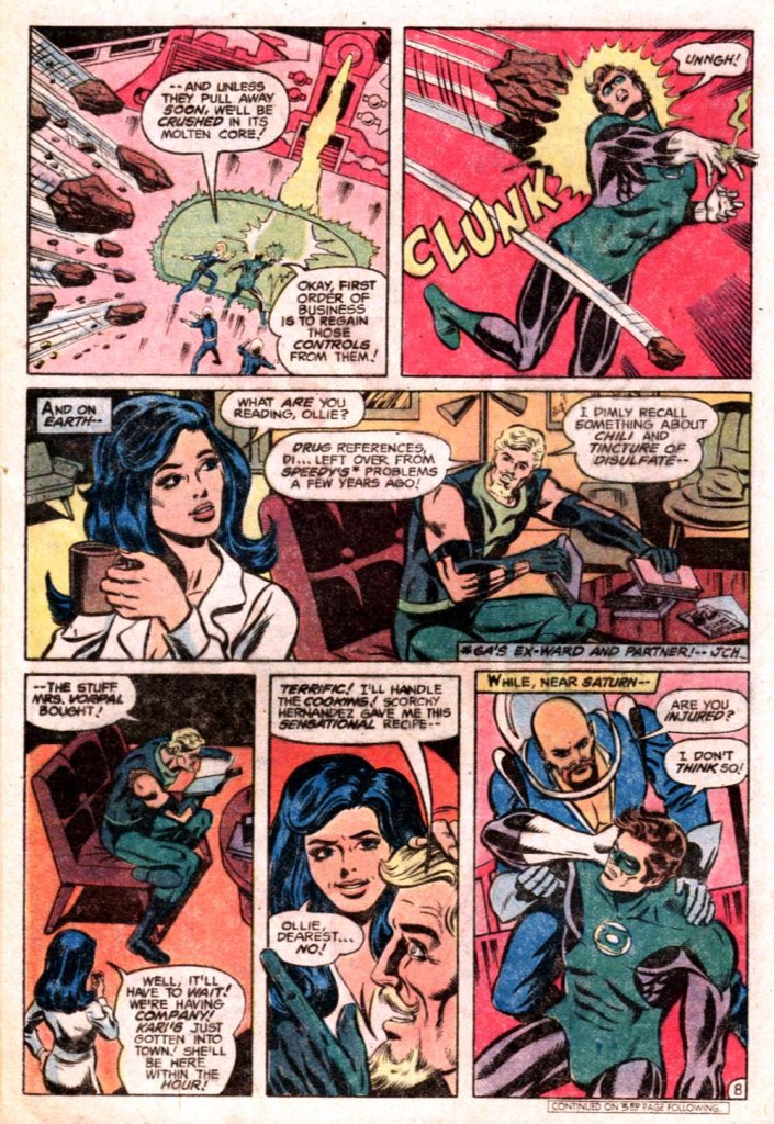 Because Kari Limbo is a comic book psychic, she’s able to pick up strange mental impressions from the revealed item. They show her a group of starships falling into the gravity well of Saturn to their destruction. Believing in Kari’s abilities, Hal swiftly charges his ring and sets off into space in the hopes of finding this space convoy and preventing disaster. Meanwhile, in a subplot that takes up a lot of space, Oliver Queen and Dinah Lance are on the hunt for a particular ingredient for Ollie’s famous chili. However, the entire neighborhood supply has been bought up by a Mrs. Vorpal, despite the fact that even a teaspoon is enough to provide a dangerous level of heat. As the pair follows the woman’s trail hoping to be able to get a supply of the stuff for themselves as well, they learn that she’s also purchased a pound of rat poison. So something weird is going on.