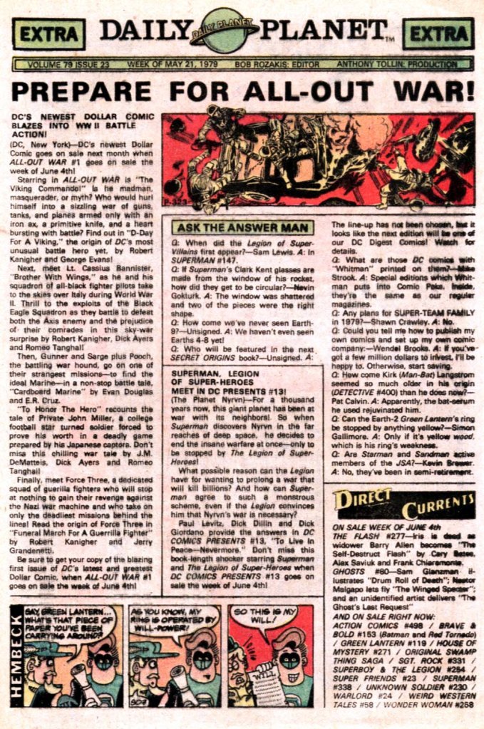 This issue also carried the weekly Daily Planet promotional page, but a different edition than the one that ran in yesterday’s BRAVE AND THE BOLD issue. It featured a much better gag from Fred Hembeck in his regular comic strip as well as another Answer Man column and the regular previews and spotlight on upcoming titles. This checklist may have been where I first heard about Iris Allen having been killed, but it didn’t make any impact on me as well–buried in that line item, I imagine that I took it to simply be typical hyperbole. Having missed the two most recent issues of THE FLASH, I was oblivious to what had been going on in its pages.