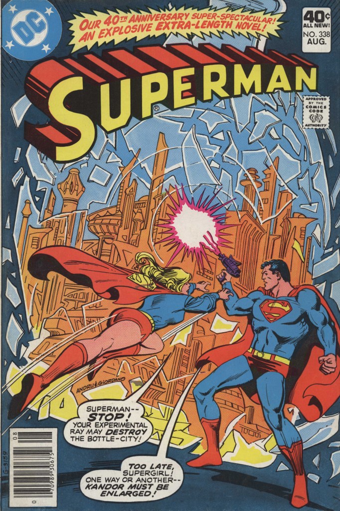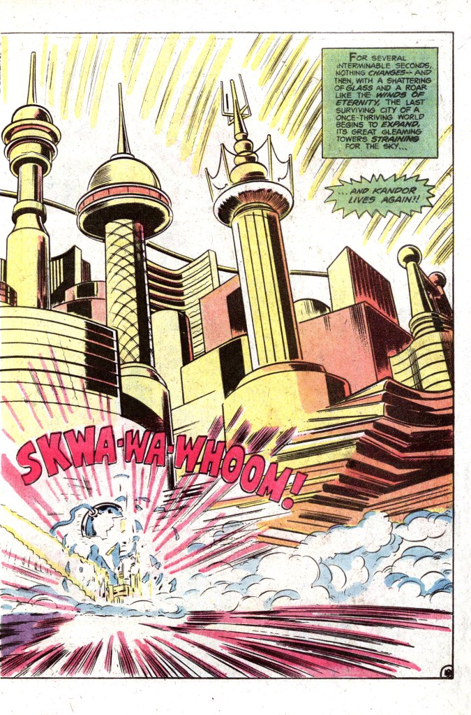 This next issue of SUPERMAN was a bit of a minor milestone and it was heavily promoted in house ads throughout the DC line at the time. It was also the 40th Anniversary Issue of the title, and while it wasn’t upsized to mark the occasion, that did provide cover for this story was being done now. After being a fixture in the Man of Steel’s world for more than two decades, this was the story that was going to write out the Bottle City of Kandor, that remaining relic of the doomed planet Krypton that Superman kept safely stores in his Fortress of Solitude and which allowed him to talk among his own kind as a normal man whenever he so desired.