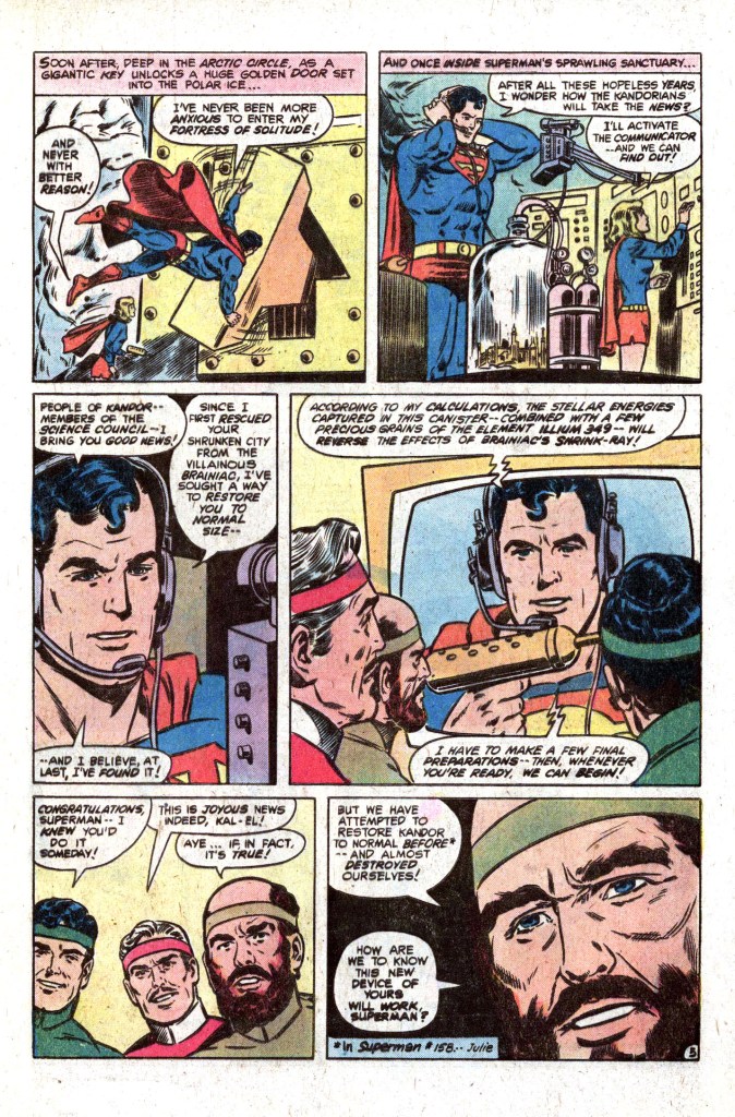 I never understood why enlarging Kandor was such a big deal. They’re Kryptonians. Being a few inches tall shouldn’t have been a problem. Superman could have just released them all on the moon and they could have built themselves a nice new, built to size city there.