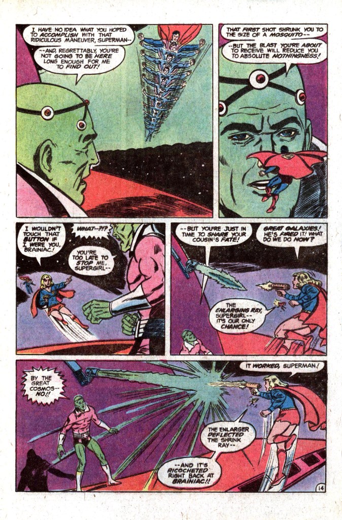Of course, the problem Superman now faces is in getting Brainiac to turn his shrinking ray on him, even though he’s tried and failed to reduce Superman in size before and failed. So the two enemies engage in battle with one another, and Superman uses every strategy he can think of to get Brainiac to use the ray. Ultimately, he lobs a colossal asteroid at Brainiac and his ship, and the android counters by attempting to shrink it. But before that can happen, Superman pulverizes the space rock and takes the full impact of the ray himself. But Supergirl has been prepared for this, and to prevent Brainiac from completely destroying her cousin, she counters with the Enlarging Ray they’ve built–which has the unforeseen side effect of blowing back Brainiac’s reducing charge at him, causing the criminal to shrink to subatomic size, never to return (until he inevitably does, of course.) What’s more, the Enlarging Ray works perfectly, restoring superman to his regular dimensions and proving that the same can be done for the Kandorians