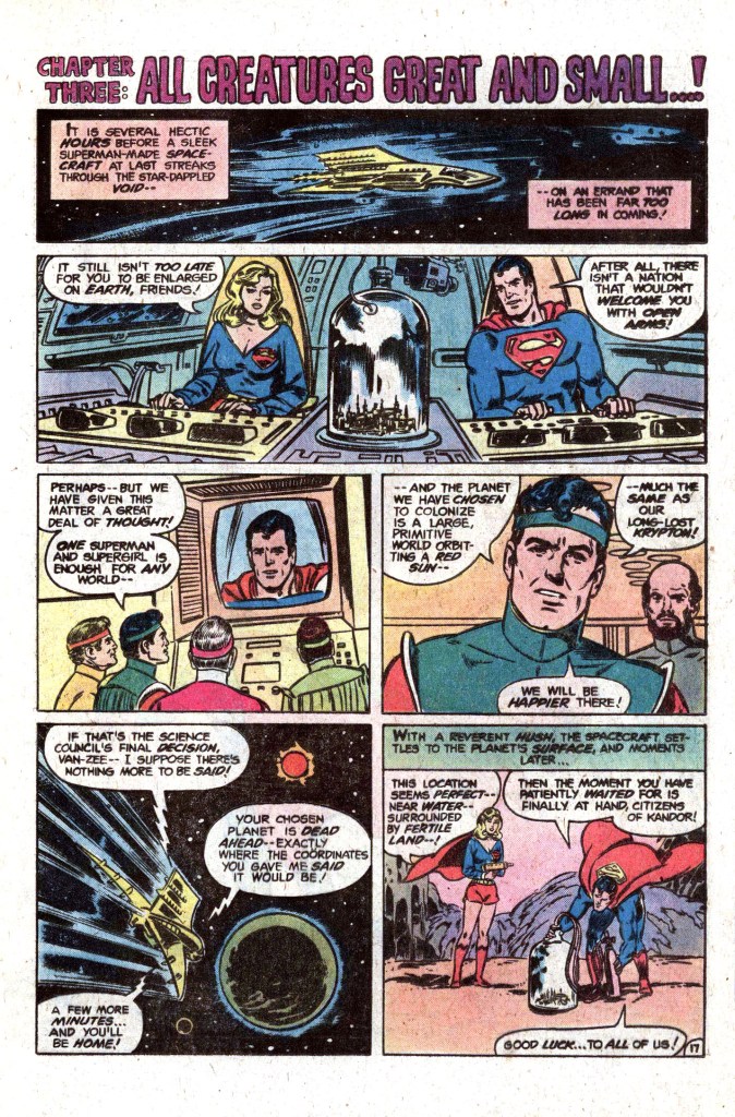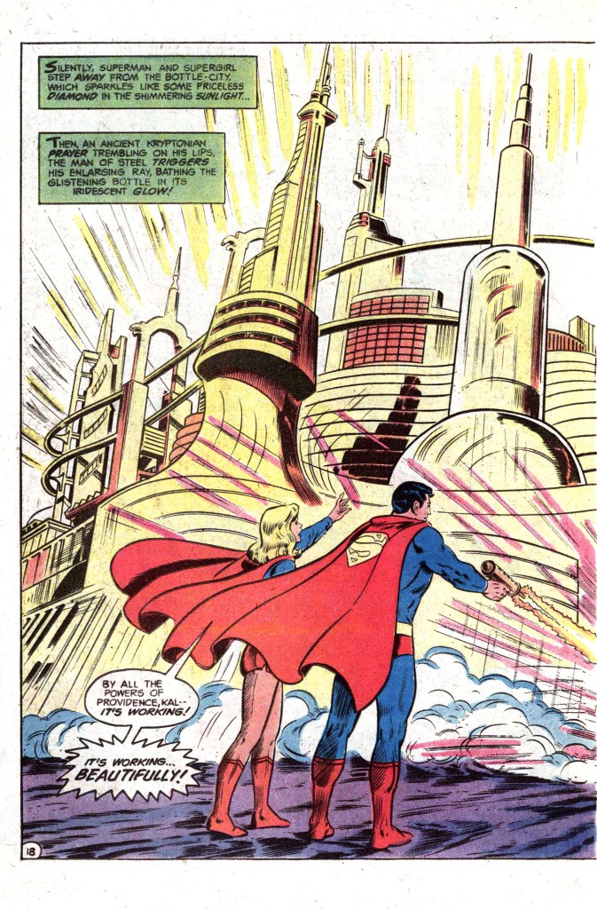 The narrative jumps ahead at this point, and shows Superman and Supergirl piloting a spacecraft towards an uninhabited planet in a star-system orbiting a red sun similar to that of Krypton–and which will prevent any of the released Kandorians from developing Superman-like powers. We’re told that the population of Kandor voted for this plan, though that seems a bit difficult to believe–who wouldn’t want to be a Superman rather than just a person among many on a remote planet? And so, in a big double-page spread, the Man of Steel turns his Enlarging Ray on the now-bottleless city and it expands to its original size: