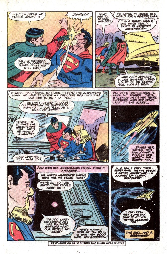 Superman offers to remain on New Krypton and help with the rebuilding, but his friend Van-Zee cold-cocks him, knocking him out. He wakes up in the spaceship heading back to Earth alongside Supergirl–and then we learn about the final piece of contrivance in this story, The planet that the Kandorians have chosen to be New Krypton is a “Brigadoon” world that only appears in our universe every once in a while. So when Superman regains his senses, New Krypton is already gone, moved back to some other dimension where he and Supergirl won’t be able to locate it. This is all treated fairly nonchalantly, and neither Kal-El nor Kara seem especially broken up about not ever seeing their brethren again (Supergirl’s parents were on that world, remember?) And that’s all she wrote for the Bottle City of Kandor in the Bronze Age. Of course, it was such a seminal part of the superman mythos that later creators introduced new versions of it in the Post-Crisis Superman titles, so it’s still a thing that exists today. But in 1979, Superman had finally achieved his objective.