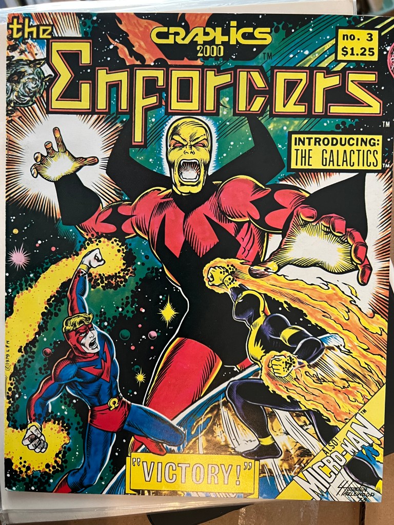 As we covered a bit last week, there were two separate issues of Larry Houston’s fan-published super hero comic magazine THE ENFORCERS that I found on my first trip to Xanadu Comics in Wilmington, Delaware. We covered the first last time: