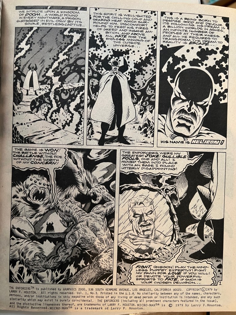 The back cover of the issue functioned as a full page ad for the next issue, THE ENFORCERS #4. Sadly, it would never be published. And so, I have no idea who the Complex Man was, other than that he came from space and was kitted out in some faux-Jack Kirby gear. But I’d have liked to find out! These two books hit me exactly in my sweet spot, especially since at the time I too was making my own comics and heroes and hoped to one day be able to make a profession out of doing so. Larry Houston, on the other hand, followed a different path, one that took him into the world of animation, where he became a leading director and storyboard artist. His personal website is at https://www.larry-houston.com/ and his on-demand collection of the three ENFORCERS issues can be purchased from IndyPlanet here: https://www.indyplanet.com/larry-houstons-the-enforcers