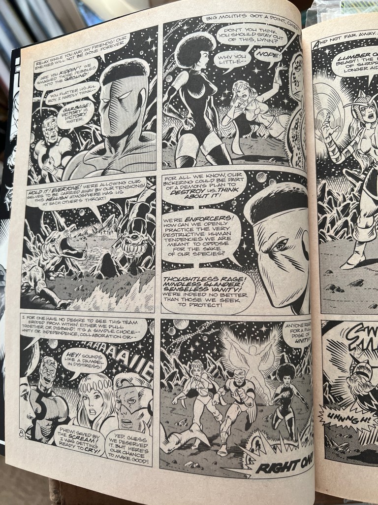 The Enforcers were a super hero team comprised of assorted single heroes in the manner of the Avengers. And like the Avengers, they often took to referring to one another as “Enforcer”. The strip wasn’t really disguising its influences. This issue opens up with Helicon, the team’s secret demonic enemy watching from afar as the conflict that he’d arranged between Omegon, the team’s powerhouse member and Andromedon, the last survivor of a doomed species who sought revenge on Omegon’s people. Helicon reveals through monologuing that the creation of the Enforcers was his doing and a part of his plan to liberate himself from the dimensional prison in which he finds himself. And his daughter Marylyn, known as the Sorceress, is the key.