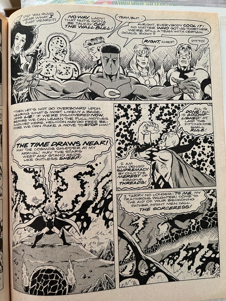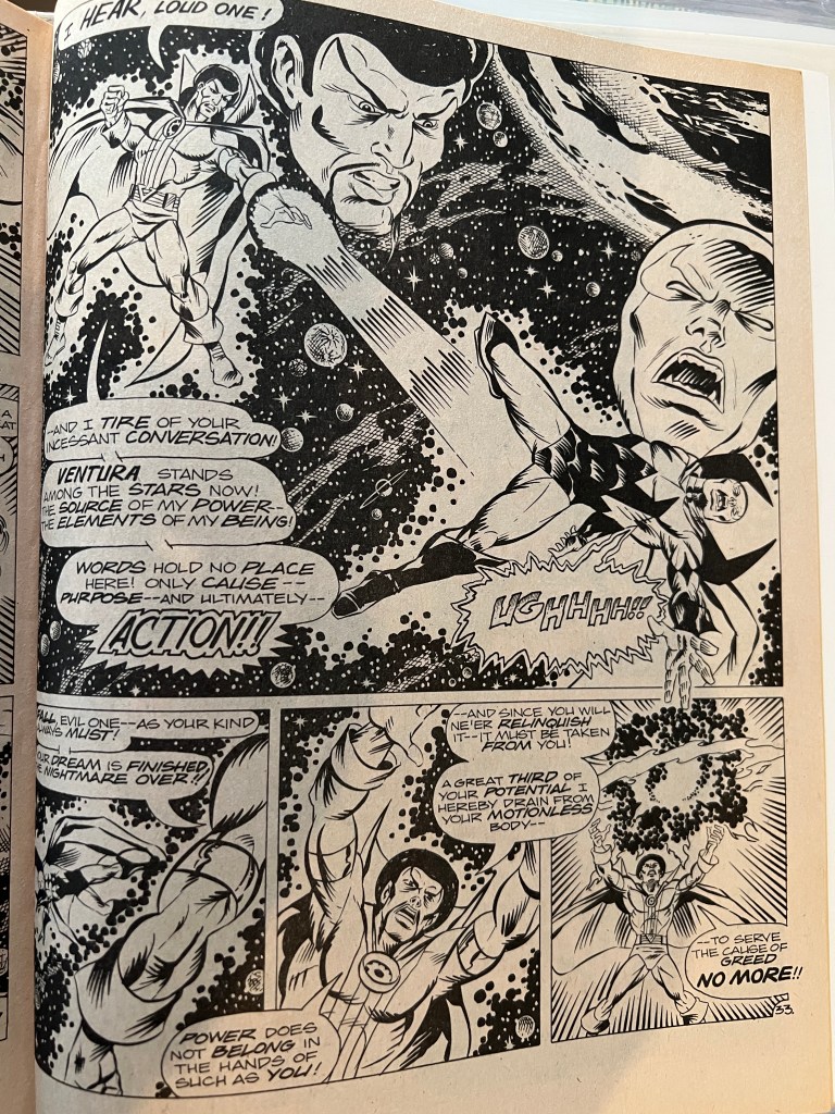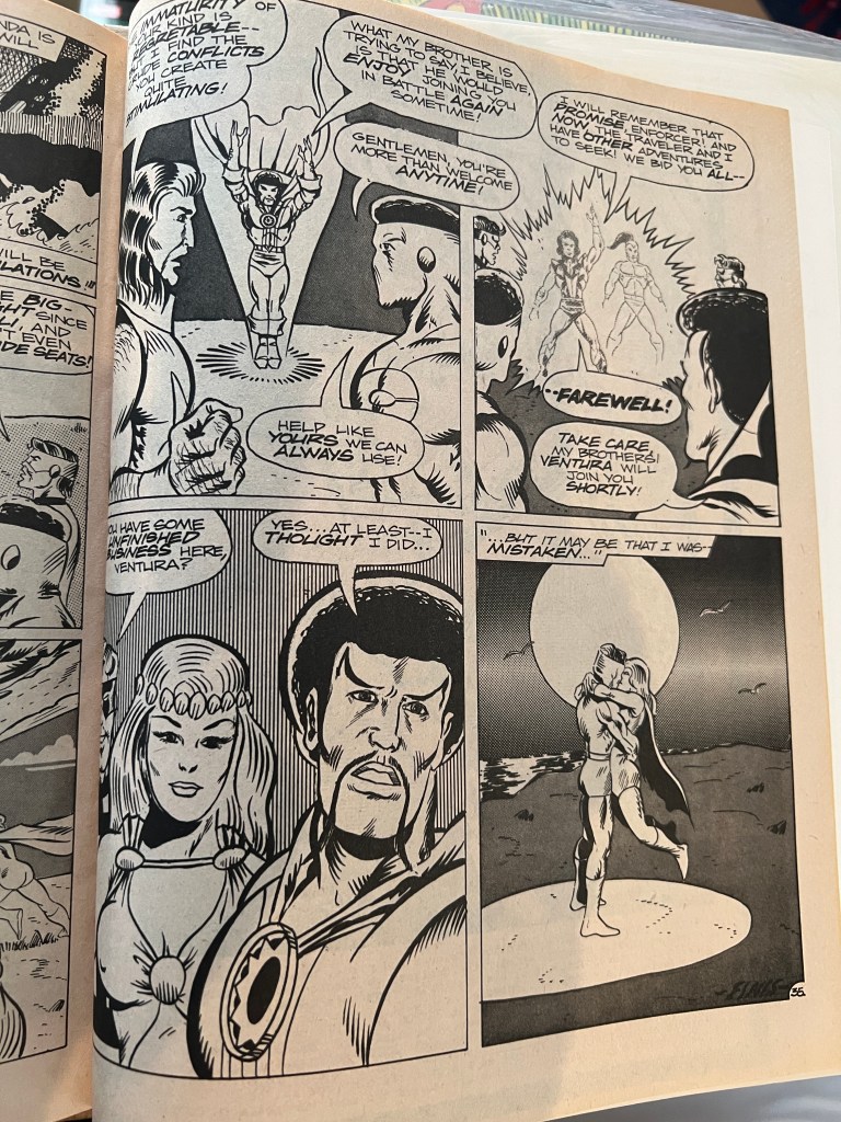 This in turn presages the arrival of three new figures: the Galactics. They’re a team of cosmic-empowered demi-deities: Ventura, Tempest and the Traveler. They seem very much inspired by Jack Kirby’s New Gods by way of Kirby and Lee’s Asgard, but perhaps the most notable thing to my eye at the time was the fact that Ventura, the leader and spotlighted character, was black. There had been black characters among the New Gods, but none that commanded the presence and respect that Ventura does in this story. He’s set up as a very big gun.