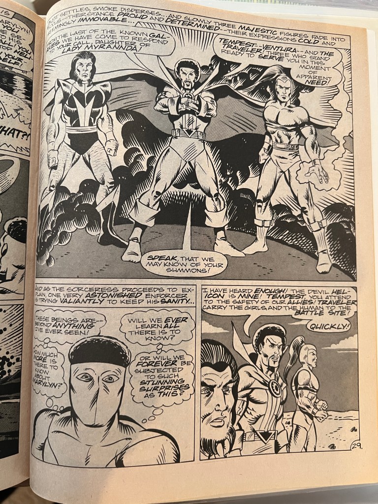But at this point, Helicon is ready to make his move, and he casts a spell to release himself from his prison, manifesting among Omegon, Andromedon and the Sorceress and breaking up their running battle. Now in the company of Lady Myrranda, the other Enforcers are able to follow, bringing all of the characters to a single location for the first time in these two issues. But Helicon is beaucoup powerful, and he’s able to easily fight back the entire assembled team as well as the hangers on. Things look bad for the good guys at this point. It’s at this moment that the Sorceress acts to bring in a Deus Ex Machina. She casts a summons to one whom she says was once as close to her as the Omegan is today.
