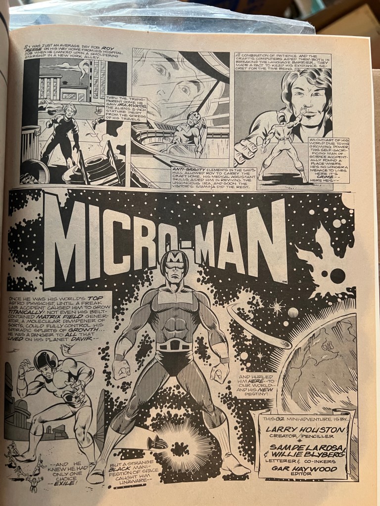 The book also included a four-page back-up feature spotlighting yet another hero, Micro-Man. It had clearly originally been intended for something else, some other fanzine possibly. But the dimensions of the art and the size of the lettering are markedly different from the lead tale. it concerned the adventures of a tiny alien being who had come to our planet inadvertently after posing a threat to his homeworld of Davir. On our world, Ira Mykos was the size of an action figure, but that didn’t stop him from fighting crime and doing typical super hero things, all in the company of his Earthling friend Roy Reese. There wasn’t much more to this short than a proof-of-concept, but it was yet another character who served to help fill out a whole world of new super heroes.