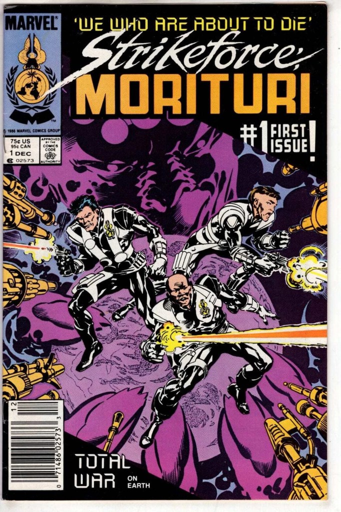 Not every title originally conceived for the New Universe initiative wound up being released under its auspices. Certain titles fell out as the parameters of the new line shifted during the development process. One such series was STRIKEFORCE: MORITURI, a super hero war series set in the future. As pitched by writer Peter B. Gillis to editor Carl Potts, STRIKEFORCE: MORITURI was greenlit as the first New Universe title. Potts speaks about this development, and the early days of the New Universe, at his blog here: https://generaleclectic123.blogspot.com/2008/09/marvelous-tales-secret-origin-of-new.html