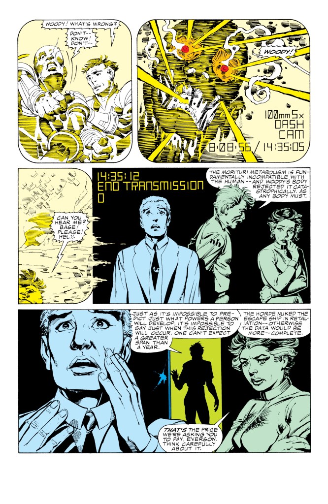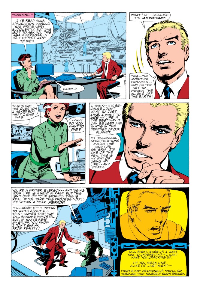 This first issue introduces us to the world and the situation through the eyes of Harold Everson, soon to be called Vyking but here nicknamed R.B., or “Rabid Beaver”, by his co-workers. A would-be writer, he’s volunteered to undergo the Morituri Process in part due to reading the comic book recounting of the Last Stand of the Black Watch, who were the first to undergo the process. But Everson doesn’t really fully comprehend what he’s signing up for, and we see his worldview start to change as he learns the truth about the Black Watch’s final, fatal mission (two of them died in the process of activating their powers, two were killed horribly in battle, and the last was doomed by the Morituri Process itself just prior to the end of the mission.) But all of this doesn’t shake Everson’s determination to do something worthwhile with his remaining time, and so he undergoes the process, becoming one of six characters whom we’ll follow throughout the series’ first year, all of whom are doomed to perish. Everson himself will be killed by Morituri Rejection in issue #6, in a move that was both shocking and yet also utterly necessary.