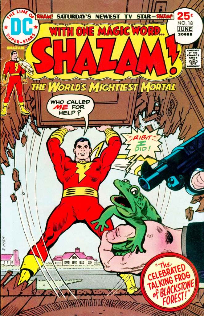By 1975, the 100-Page Super-Spectacular format had proven to be unsustainable, despite my enormous love for it, and so it was phased out. Ongoing series that had transitioned to the format, such as BATMAN and JUSTICE LEAGUE OF AMERICA, went back to being regular-sized comics again. And the same thing happened with SHAZAM as of this issue. The big difference here, at least to me as a reader, was that the most appealing thing about most of the recent issues of SHAZAM had been the classic reprints from the character’s Golden Age releases. Now, those were gone, and the series was going to need to muddle through on just its new material. To cut to the chase, the series was almost cancelled during this period, despite having a popular Saturday morning live action show to help promote it. The book would soon go quarterly and all-reprint, sustained only because the TV program continued to run. But we’ll get there in due time.