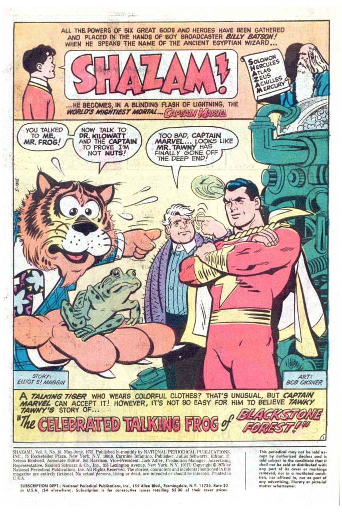 The lead story was written by Elliot S! Maggin and illustrated by Bob Oksner with editorial oversight provided by Julie Schwartz. it’s another good example of the silliness and self-parody that began to infect Captain Marvel’s adventures in DC’s hands. The entire thing is a bit of a riff on the well-remembered Warner brothers cartoon “One Froggy Evening” in which a man finds a singing frog that he thinks will bring him fame and fortune but who refuses to sing in the presence of anybody else. In this story, though, the person on the hook is Mr. Tawky Tawny, himself a talking tiger, so the bit is slightly different. It’s all very low-stakes, and lacks the verisimilitude of the best Marvel adventures. Maggin and Schwartz seem uncertain about what level to pitch their material to, and they wind up skewing too young.