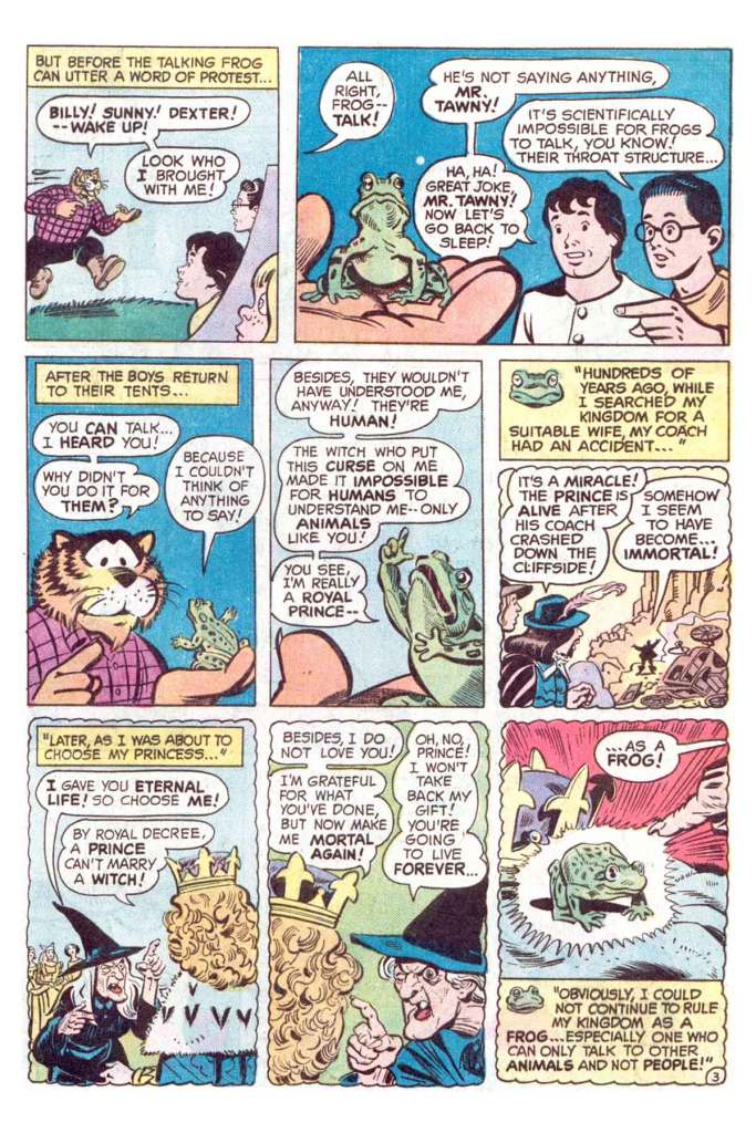 Captain Marvel foils the plot to steal the frog, but not before Mr. Tawny can perform a heroic act on behalf of the frog and break the spell. It transforms back into the human form of Prince Maxwell Phrogue, whose still a bit of an ugly duckling. Captain Marvel ends on a bit of a moral about it being more important to have friends than it is to be good-looking, and the story wraps up. Bob Oksner does his best to emulate the work of creator C.C. Beck, but it feels a bit like he’s operating with one hand tied behind him. I suspect the art on this feature would have looked better if he simply drew it in his own regular style. But, yeah, this story was a snooze without a lot to recommend it.