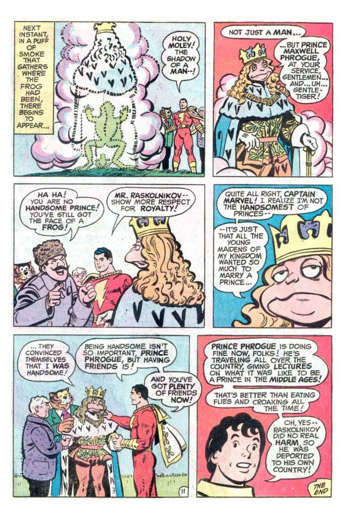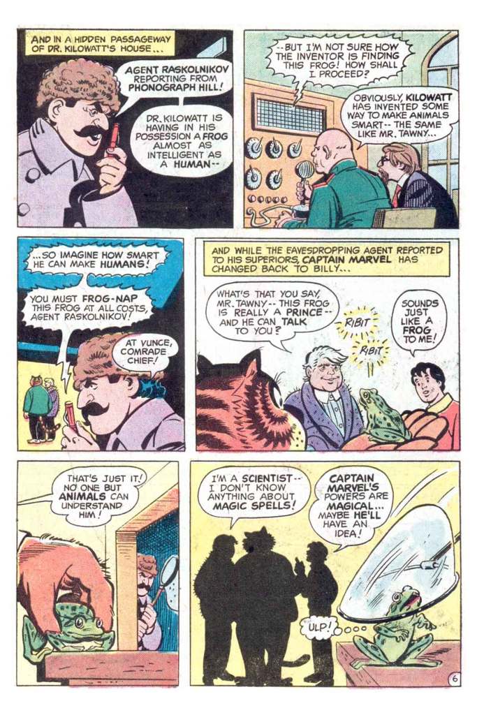 The story begins with Mr. Tawny encountering the talking frog, who claims to be a prince cursed by an evil witch. But while Tawny can head the frog speak, nobody else can–he’s unintelligible to humans. Tawny and Billy take the frog to Dr. Kilowatt in the hopes that he can prove its intelligent. And the frog is so smart that it overloads Kilowatt’s brain-o-meter, causing it to explode. Captain Marvel is able to save the day and provide a little bit of color at this point. Unfortunately, sinister quasi-Russian spy Agent Raskolnikov has Kilowatt’s place under observation, and he thinks that the doctor has found a way to increase the frog’s intelligence. So he swipes it, intending to take it back to the motherland and divine its secrets.