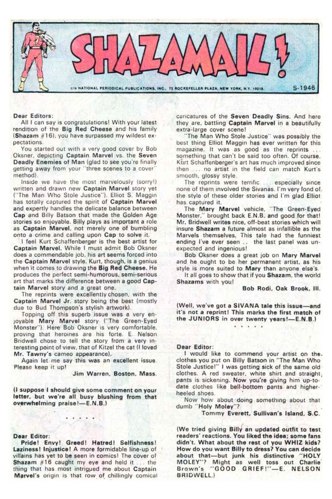 The SHAZAMAIL letters page came next, including a comment from future author Bob Rodi, a regular contributor to editor Schwartz’s letters pages. There’s also a letter from a Jim Warren, but this is certainly not the publisher of the Warren magazine line but rather some other similarly-named reader.