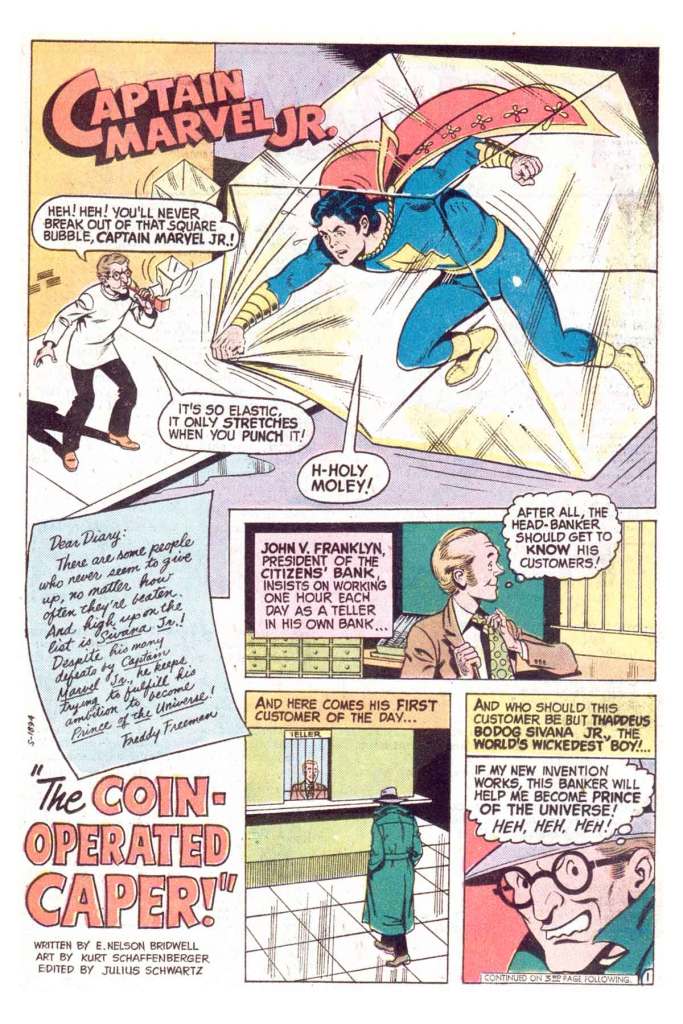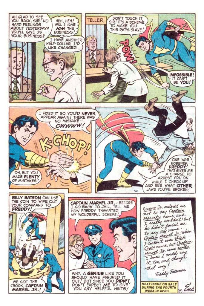The story is only seven pages long, but it’s got a simple and clever bit at the center of it. After Junior foils the latest scheme of Sivana Jr., the long-suffering son of Captain Marvel’s persistent foe, the second-generation villain devises a way to hypnotize Freddy Freeman into not being able to say his magic words ever again. He can’t even think them. But Junior realizes that he can still say his own name, which contains the enchanted phrase Captain Marvel, and so he’s able to restore himself and clobber Sivana Jr. It’s a simple but effective piece.