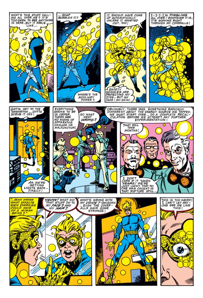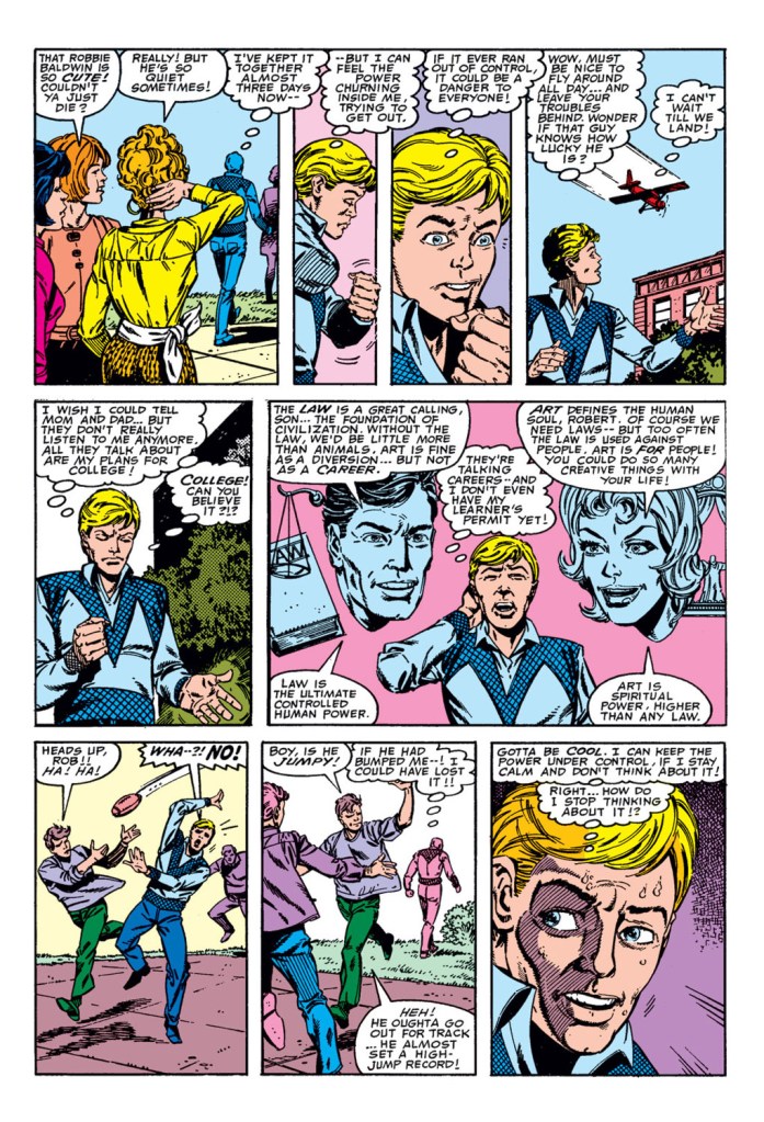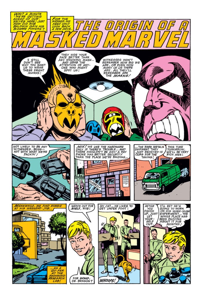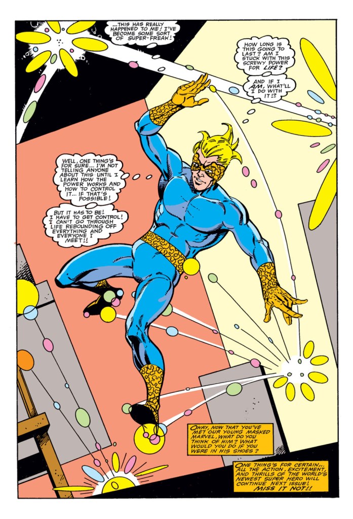 The concept for the character was relatively straightforward; Robbie Baldwin was a typical high school aged kid, not especially brainy or athletic. His father was a District Attorney with a strong love of the law, whereas his mother was a former actress and teacher who espoused the power of art–this tug-of-war between law and art would be one of the running backdrops of the series. Baldwin also had a weekend job at a gofer at Hammond Labs in his hometown of Springdale, Connecticut, and one day while he was working there, he accidentally got caught up in the scientists’ attempts to harness an interdimensional energy source. The energy field that Baldwin was exposed to bonded to him, altering his appearance and voice and giving him the appearance of a masked super hero. It also created a kinetic energy field around him that caused him to repel and react to any force directed against him. In practical terms, if you hit him, he bounced. In his new form, Robbie wound up foiling some criminals who had come to loot the lab at which he worked. And while he found that if he calmed himself, his kinetic field and strange appearance would subside, any sudden impact would start him bouncing again, and transform him into the Masked Marvel. So he was forced to go through life afraid of jostling into anybody accidentally and starting the whole process over again.