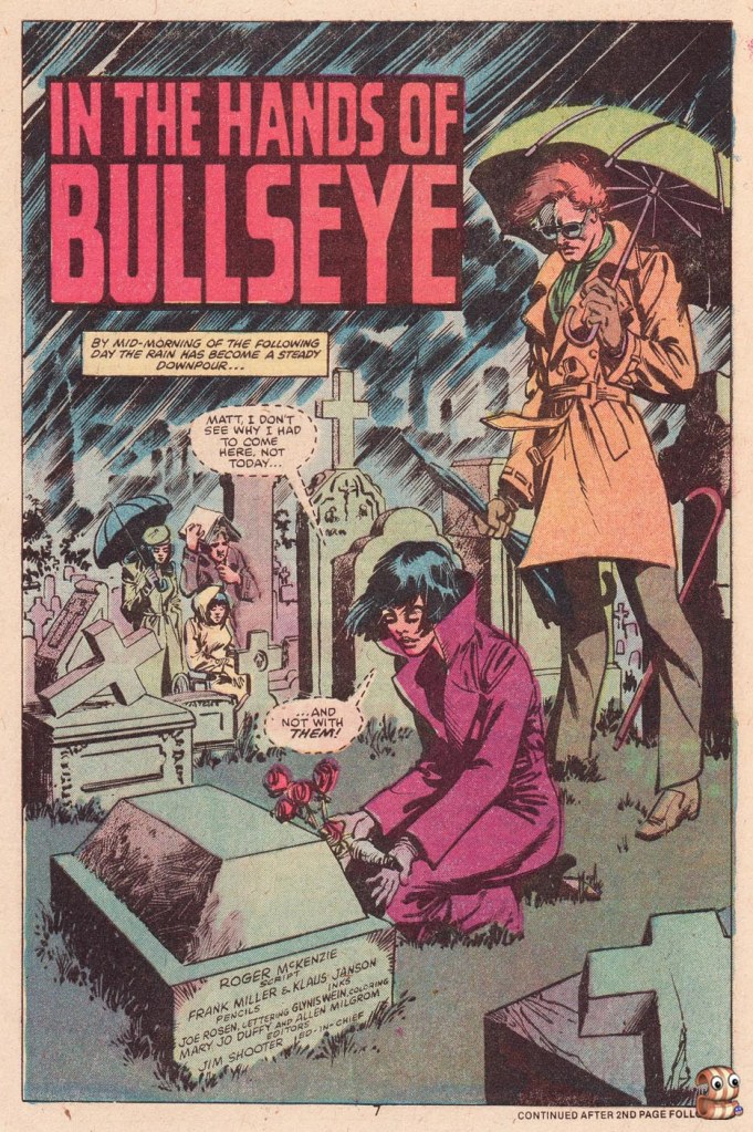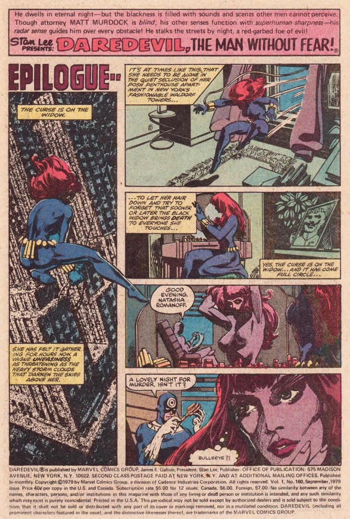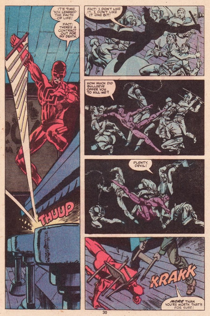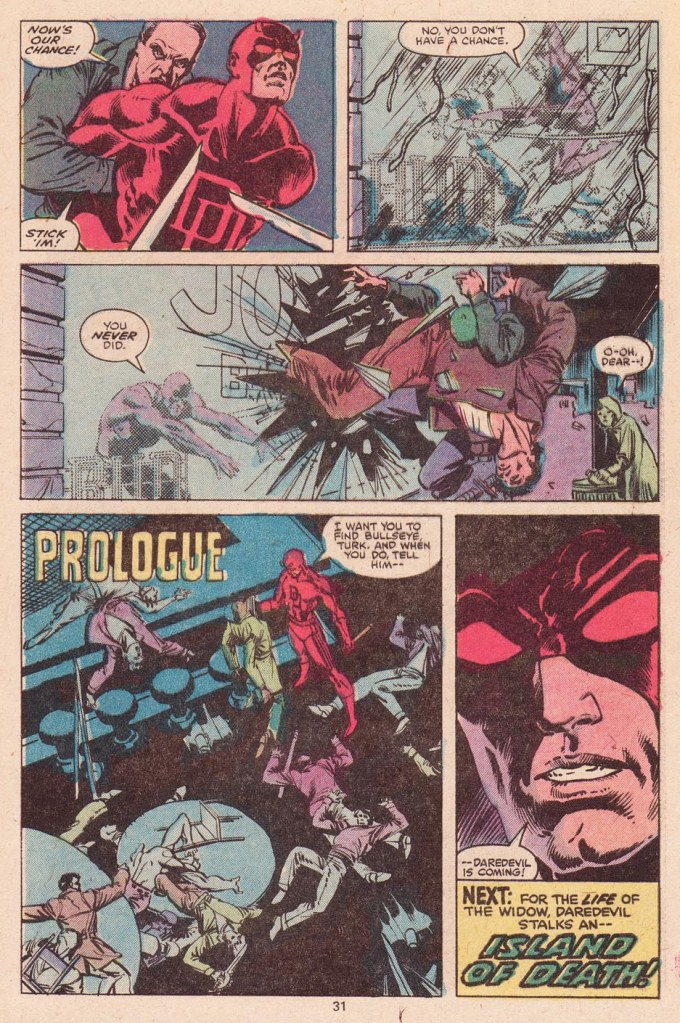 At this point, the remainder of the story is Daredevil beating the heck out of the assorted goons and gunsels in Josie’s Bar, shattering her front window for the first time in what will become a running bit. The lowlife Turk is introduced in this issue as just another crook in the mix, but he’ll return too under Miller as a recurring comedy relief character. And the issue ends on a Prologue, the opposite of how these things are typically oriented, in which Daredevil tells the defeated bad guys to tell Bullseye that he’s gunning for him. To Be Continued.