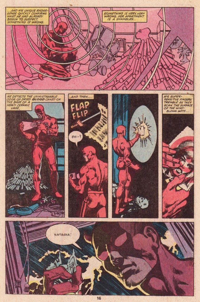 DAREDEVIL was a series that I had been buying and enjoying for about a year, but right around here it started to steadily get better and better–in such a gradual way that you almost didn’t notice it happening. Most of this was down to the arrival of new penciler Frank Miller. As these books were being produced “Marvel style” –i.e with the writer producing a plot that the artist would draw the issue from, then adding in the dialogue and copy after the fact–Miller was able to apply his storytelling chops to the series straight away from the jump. and while he’d only grow more polished and certain about his artwork as time went on, he already had a great sense of moving a story across the page. His skills were accentuated by inker Klaus Janson, whose gritty finish likely shored up some of frank’s weaker drawing in these early days.