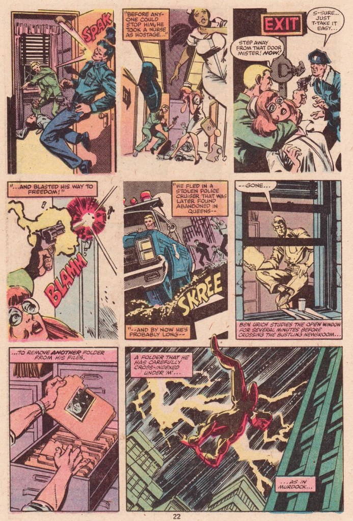 And it has to be said, Frank Miller already has a strong command of pacing across a page. A number of the pages in this early issue have interesting designs to them, or incorporate bits of business that highlight an aspect of plot or atmosphere. Miller would also typically put more panels on a page than was the norm, establishing a staccato rhythm to his stories that he could then puncture with a dramatic moment by going larger. He was also, at least at this point, hewing to most of EIC Jim Shooter’s theories on storytelling, which emphasized a reliance on medium shots with characters fully and cleanly in frame to eliminate any chance of misunderstanding. For a lot of artists, trying to do what Shooter wanted meant leeching a lot of the energy and impact out of their work. For Miller, he found ways to work within the system to highlight what he did best.