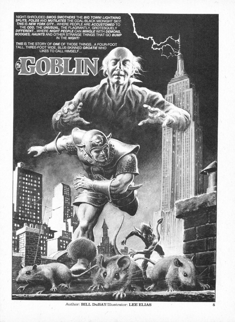 During this period, i was all over any new outfit who entered the field. In each case, I wondered if this new entrant might be the next Marvel Comics, so that I would be on the ground floor of future greatness. Few if any of them worked out that way, but I always had those hopes in mind whenever I came across somebody new doing a super hero book, and THE GOBLIN was no exception. The thing is, while it claimed to be a super hero title, THE GOBLIN really wasn’t any such thing once you got into it. It was more a collection of satirical fantasy strips than anything. Only the lead feature seemed enough like a super hero to clear the bar in my mind, and that wasn’t enough to keep me coming back. The Goblin was created by Warren writer/editor Bill Dubay and illustrated quite lovingly in a full wash style by career comic book artist Lee Elias. it was good looking stuff.