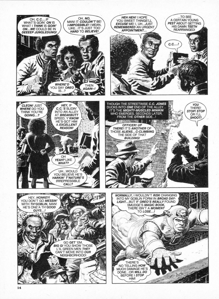 The Goblin was really Cleon Claymore “C.C.” Jones, who came across a magic book belonging to ghostly sorcerer Phinneas Smudge that allowed him to change into a four-foot-tall blue-skinned mass of mayhem known as the Goblin. Smudge’s spirit kept him company and functioned as a quasi-mentor to the kid, whereas his younger brother Penrod (nicknamed Oreo) was a constant irritant. As was the family’s slumlord landlord Mr. Grunge. In this opening story, Penrod winds up using Smudge’s book to accidentally conjure an alien invasion into existence. It’s up to the Goblin to protect the neighborhood, make everybody believe that the invasion was all just a film being shot, and maybe stick it to Grunge along the way. It was entertaining in its way, and it showed potential, but there was also something just a bit off-color and quasi-racist about the manner in which it treated it largely all black cast. So I wanted to like it, but I could also tell that something was a bit off about it.