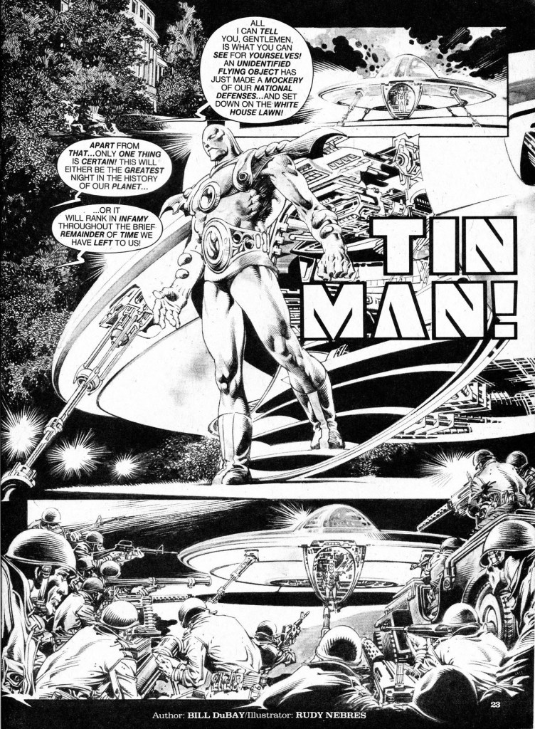 The rest of the features in this issue were of varying quality, and none of them were close to what I’d truly consider a super hero strip. The next story was Tin Man, which was about a secret cabal who, in attempt to bring peace to the world, created a faux alien landing complete with twelve-foot-tall armored robots commanding the Big Two superpowers to put down their weapons and end the Cold War. In a way, it was the same plot that Alan Moore knocked off for WATCHMEN, only executed a lot more clunkily. The artwork was by Rudy Nebres and it was lush, even though the actual storytelling and panel-to-panel continuity was a bit haphazard. Bill Dubay wrote this feature as well. This felt like a one-off, but it was positioned as a series. As I never read the other two issues of THE GOBLIN, I have no idea where it went from here, if anywhere.