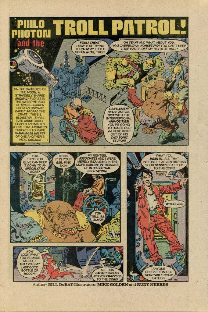 As a bit of a gimmick, the centerpiece of this issue of THE GOBLIN was a bound-in comic book section in full color and at typical comic book dimensions. The feature here was Philo Photon and the Troll Patrol, an ostensibly humorous strip by Bill Dubay, Michael Golden and Rudy Nebres about a crew of strange mutates led by a hard-drinking commanding officer. It’s trying for zany and provocative, but it lands at tedious and turgid, and is literally difficult to get through. Golden’s hand is apparent in the artwork, but he’s so buried under Nebres’ finish that he almost needn’t have bothered showing up for anything other than the storytelling. It’s the sort of premise that might have been fun in the hands of somebody like Wally Wood, whom Dubay was clearly thinking of. But the whole strip simply doesn’t work.