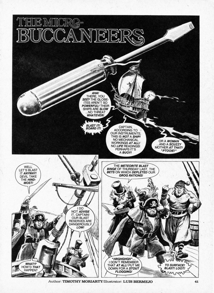 The next strip, the Micro Buccaneers, doesn’t even attempt to make itself look like a super hero outing in the slightest. Instead, it’s a space fantasy about pirates aboard a flying galleon who come to Earth, where they’re tiny in relation to the native life forms. Again, this is meant to be a comedy feature, but the humor is labored and doesn’t really land. This one is written by Timothy Moriarty and illustrated by Luis Bermejo and feels almost like a European strip that was rescripted for English-speaking audiences without any regard for the original translation. It isn’t, but it has that sort of a discordance between the copy and the images.