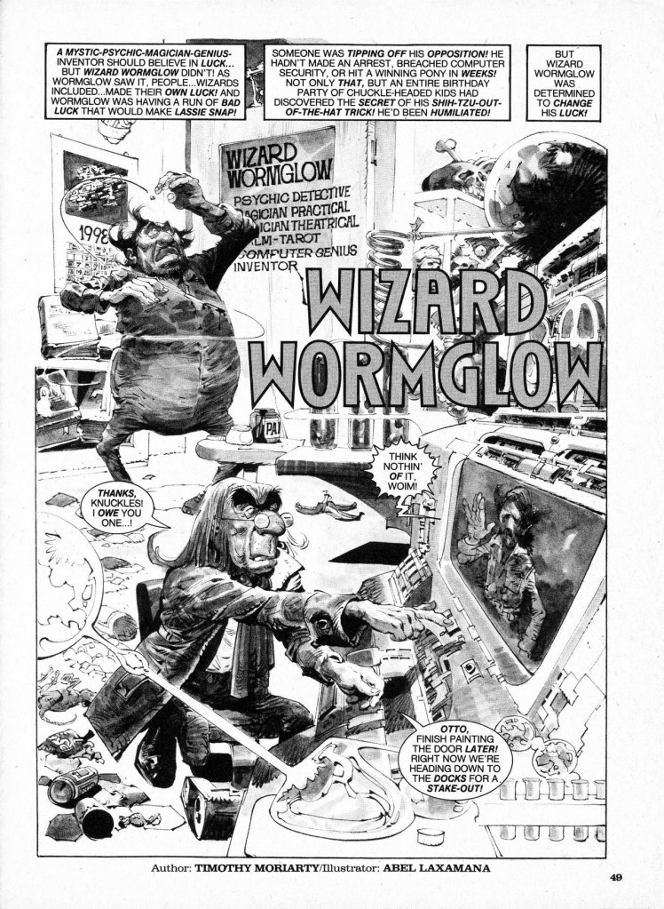 The final strip in the issue was Wizard Wormglow, also written by Moriarty and drawn by Abel Laxamana. Wormglow is a sorcerer cast in the role of a quasi-private investigator who is retained by the President (who is clearly a caricature of Ronald Reagan) to find out who is blackmailing the government by stealing its confidential files. This too is played broadly for laughs, and might have been better if it were tackled just a hair straighter. But it seems like the Warren crew couldn’t really buy into heroic fantasy in general, and so they undercut their own efforts in this magazine time and time again.