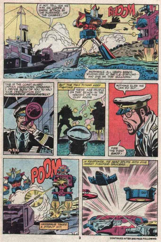 This gives Moench and Trimpe the opportunity to showcase another of Raydeen’s features, its ability to transform itself into its supersonic Firehawk mode. The Shogun Warrior gives chase and is eventually able to get within effective firing range, loosing a barrage that causes Cerberus to fall helplessly into the ocean. But when Raydeen submerges to make sure that the chaotic robot is finished, it can find no sign of its opponent, who it seems made good its escape under the cover of the waves. Elsewhere, in Japan, upon setting foot back in her mother country, Combatra pilot Genji Odashu is arrested by the authorities and taken into custody, leaving her friend and co-worker Kosei completely confused and worried about her.