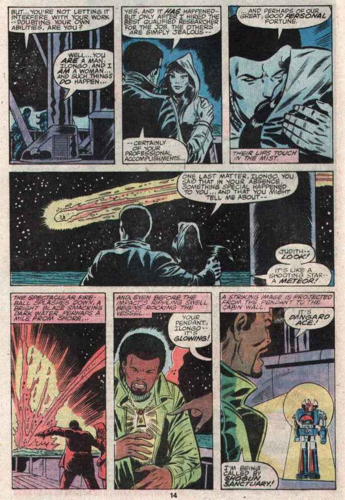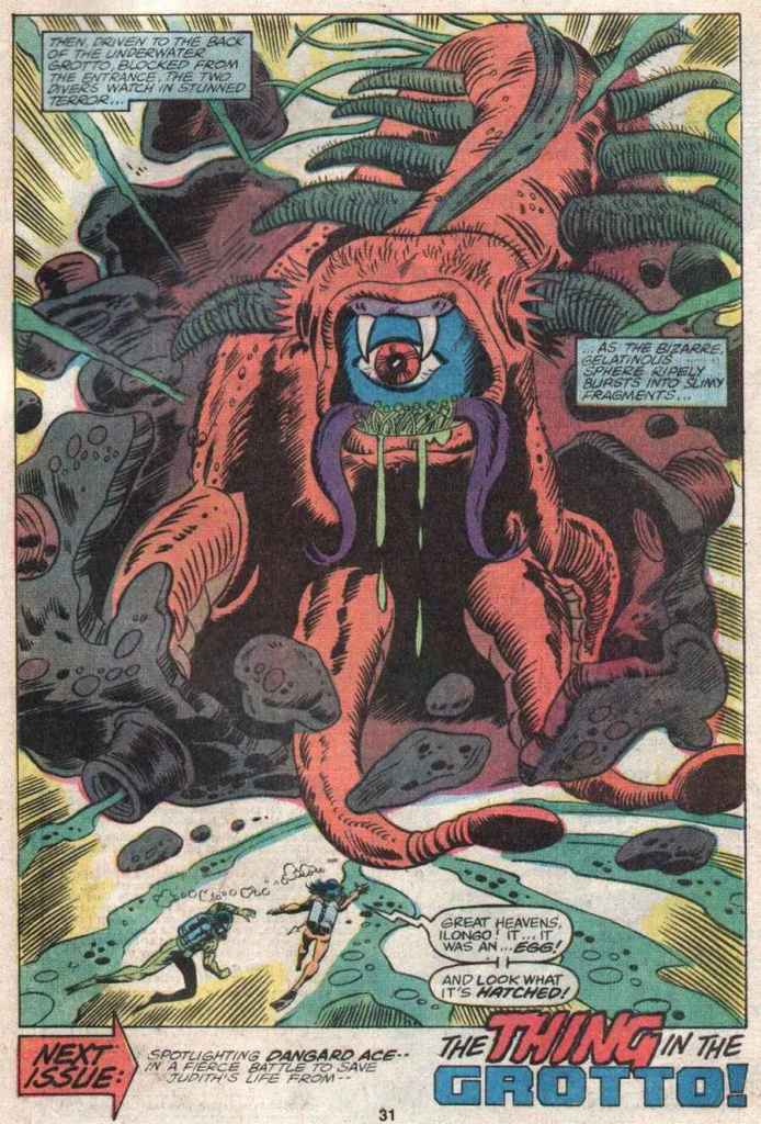 Finally, for the issue’s epilogue, we cut back to Ilongo Savage, who has executed a deep dive along with his girlfriend Judith in the hopes of seeking out the mysterious meteorite from space. Unable to locate it, the pair enters an underwater cavern, eventually locating the pulsating rock. But it turns out to be not so much a meteorite as an egg–from which hatches a monstrous, massive one-eyes creature. Clearly this Kaiju (not that that was a word my group of friends were familiar with in 1979) was going to be what Dangard Ace was going to be contending with next time. At this point, the story was To Be Continued! So as I said at the start, this issue was in no way deep or sophisticated, but in terms of being heavy on the action quotient and making the toys seem spectacular and desirable, it certainly did its job. My small group of comic book buying friends never differentiated between this any any of the other more mainstay Marvel titles in terms of its legitimacy.