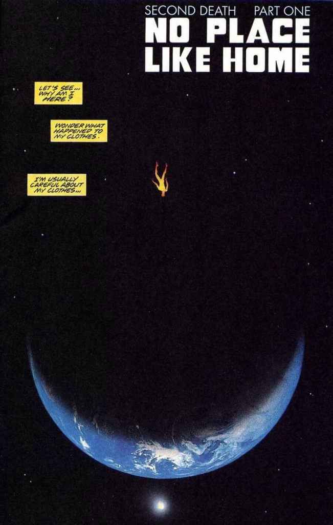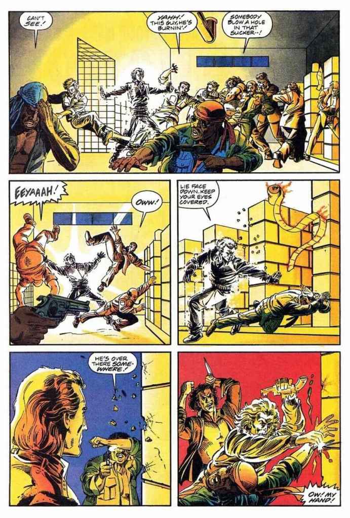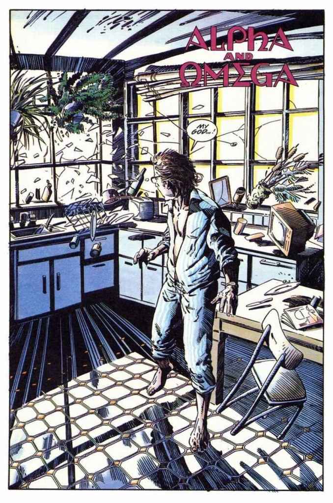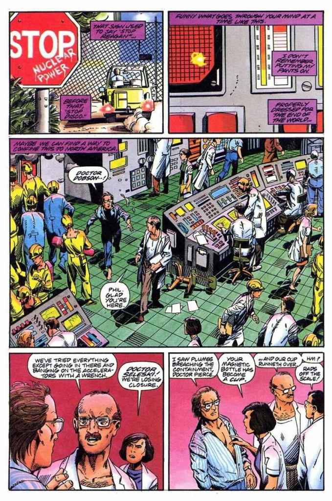 It’s at this point in the book where the “Alpha & Omega” chapter is inserted. In its pages, we’re introduced to Dr. Phil Seleski, who is awakened at his home by a ruckus outside. The nearby nuclear power plant at which he works is undergoing a critical failure, and Seleski races to the site in the hopes of being able to do something to prevent a full-on meltdown. The entire chapter is only 8 pages in length, with some nice artwork from Barry Windsor-Smith and Bob Layton that’s colored perhaps just a hair too garishly in full process color. The idea is that the individual chapters could be pulled out and assembled into a SOLAR #0 once teh story was concluded, though I can’t imagine many readers in 1991 choosing to deconstruct their comics in such a fashion. The segue back out of the origin story and into the main feature is similarly a bit abrupt and confusing.