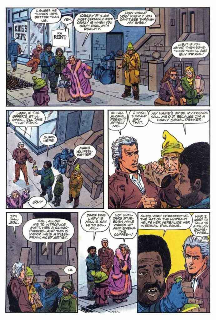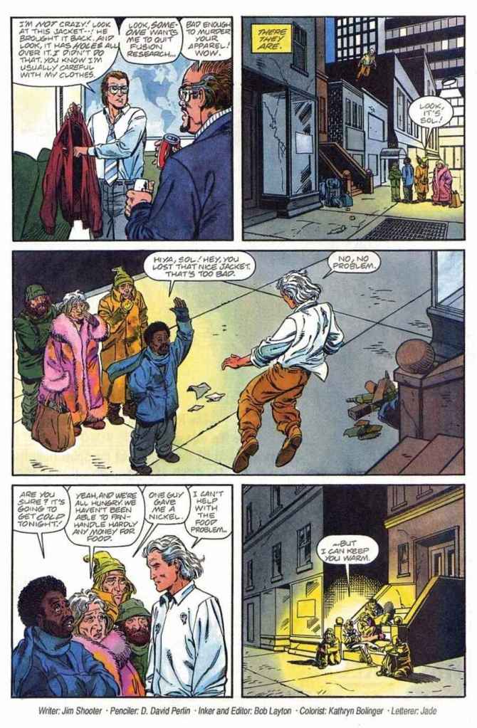 As the main story picks up, the glowing Seleski transports the Russian missiles into space, where he causes them to detonate, reconstructing his physical form Dr Manhattan-like after this has occurred. From there, he heads back down to the city, attempting to puzzle out his circumstances. He winds up interacting with a group of homeless people, and a discarded newspaper tells him that he’s somehow traveled backwards in time, to a point before teh accident that empowered him. Realizing this, Seleski heads back to his home, where he delivers a warning to his younger self, telling him that he’s not going to stand by and watch him make the same mistakes that he himself made–even if he has to kill his earlier self. Then he returns to the street community that has accepted him as one of their own. The call him Sol, due to the fact that he glows from time to time. And that’s where this first issue wraps up. There isn’t any costume introduced, nor is Solar called by that name in full nor Man of the Atom. In fact, one could be forgiven for thinking that this isn’t a super hero comic book at all.